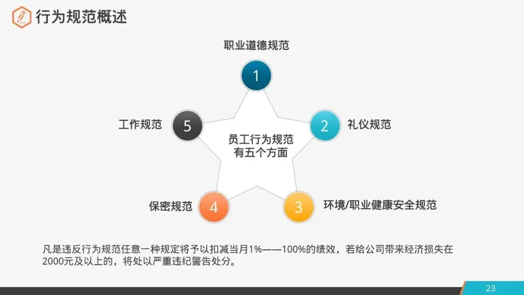 凡是违反行为规范任意一种规定将予以扣减当月1%——100%的绩效,若给公司带来经济损失在2000元及以上的,将处以严重违纪警告处分。