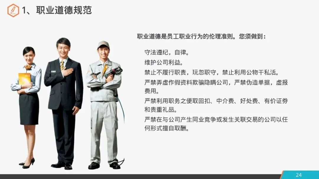 职业道德是员工职业行为的伦理准则。您须做到: