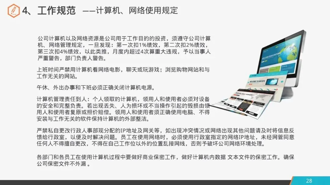 公司计算机以及网络资源是公司用于工作目的的投资,须遵守公司计算机、网络管理规定,一旦发现:第一次扣1%绩效,第二次扣2%绩效,第三次扣4%绩效,以此类推,月度内超过4次算重大违规,予以当事人严重警告,部门负责人警告。