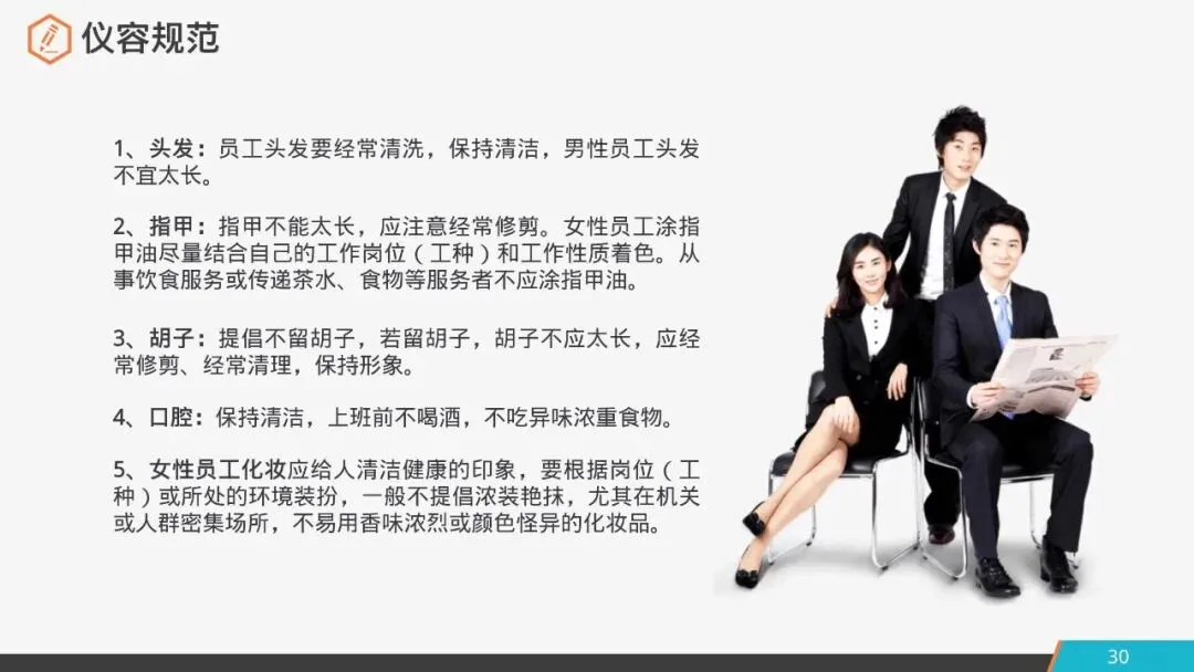 5.女性员工化妆:应给人清洁健康的印象,要根据岗位(工种)或所处的环境装扮,一般不提倡浓装艳抹,尤其在机关或人群密集场所,不宜用香味浓烈或颜色怪异的化妆品。
