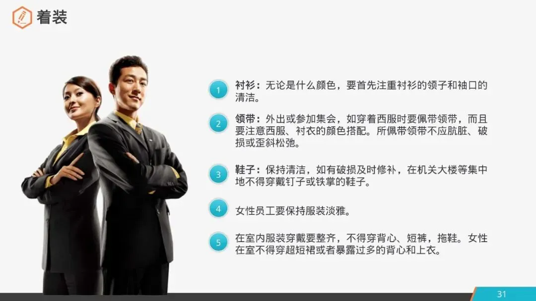 4.女性员工:要保持服装淡雅;在室不得穿超短裙或者暴露过多的背心和上衣。