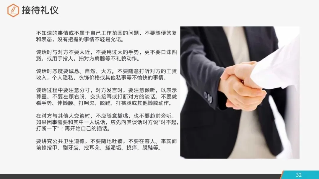 2.谈话时与对方不要太近,不要用过大的手势,更不要口沫四溅,或用手指人,拍对方肩膀等不礼貌动作。