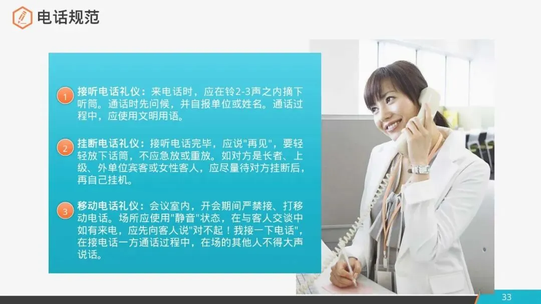 1.接听电话礼仪:来电话时,应在铃2-3声之内摘下听筒。通话时先问候,并自报单位或姓名。通话过程中,应使用文明用语。