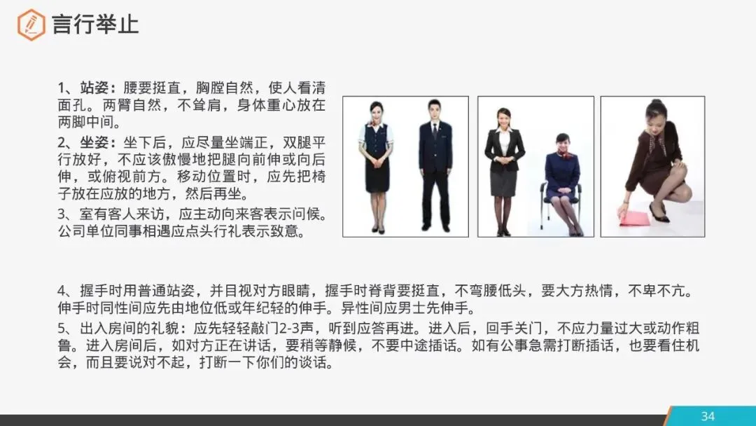 3.室有客人来访:应主动向来客表示问候;公司单位同事相遇应点头行礼表示致意。