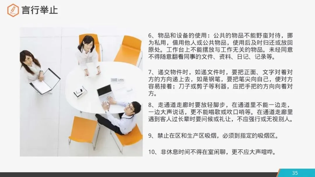 6.物品和设备的使用:公共的物品不能野蛮对待,挪为私用,借用他人或公共物品,使用后及时归还或放回原处;工作台上不能摆放与工作无关的物品。未经同意不得随意翻看同事的文件、资料、日记、记录等。