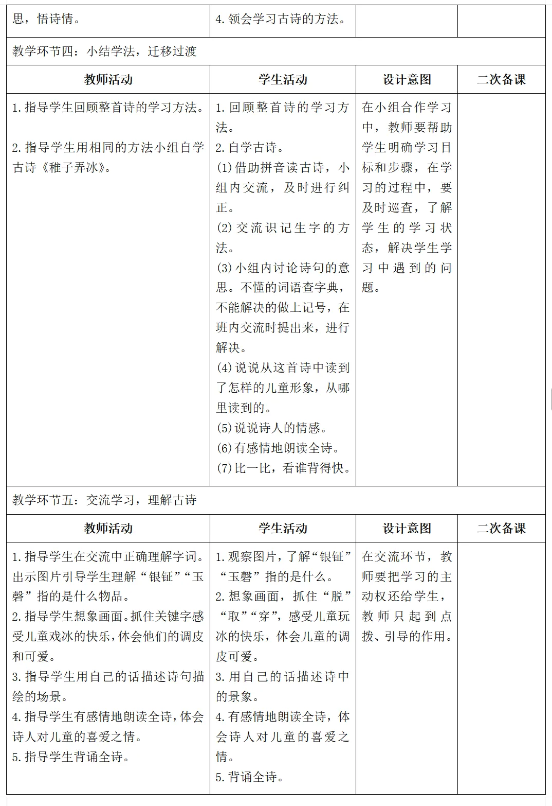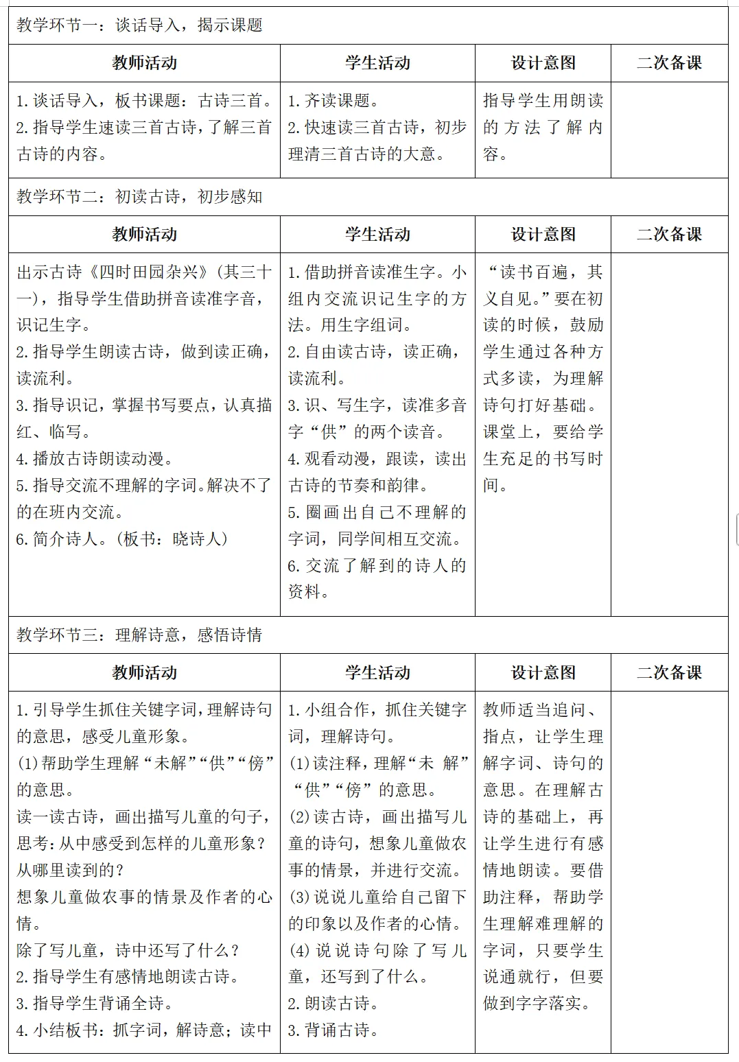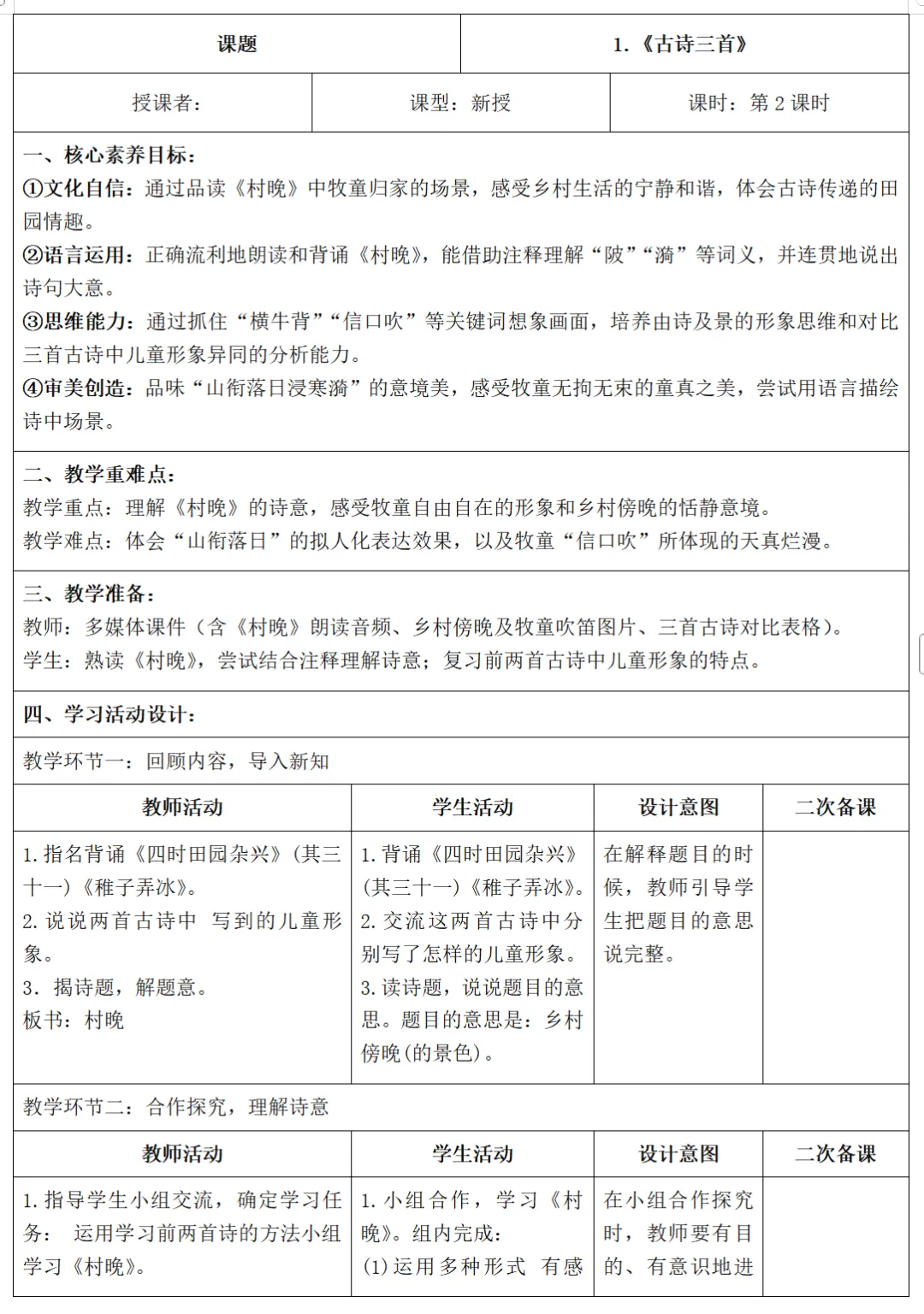 26春新版人教版四年级下册语文核心素养教案(表格版)