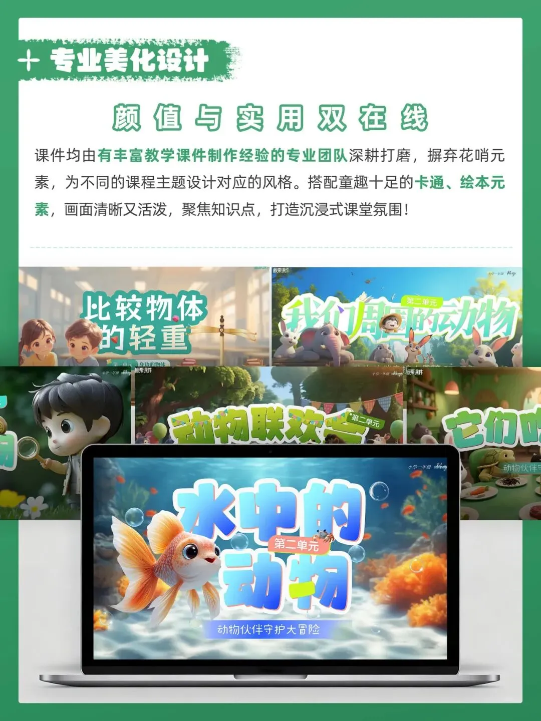 这是一套教科版小学科学一年级下册课件,共15套,配套教案与视频素材。它以大单元情境贯穿课堂,通过趣味互动、科学实验和生活化任务激发学生兴趣,还设置当堂检验巩固知识,专业美观的设计让备课更高效,非常适合新手老师和任务繁重的教师使用。