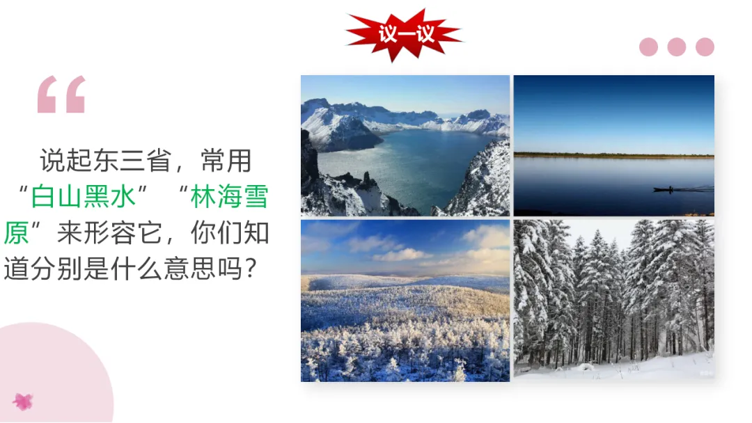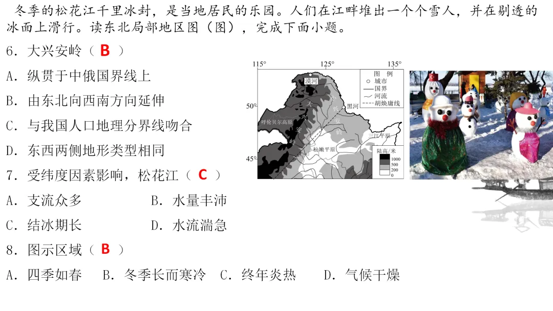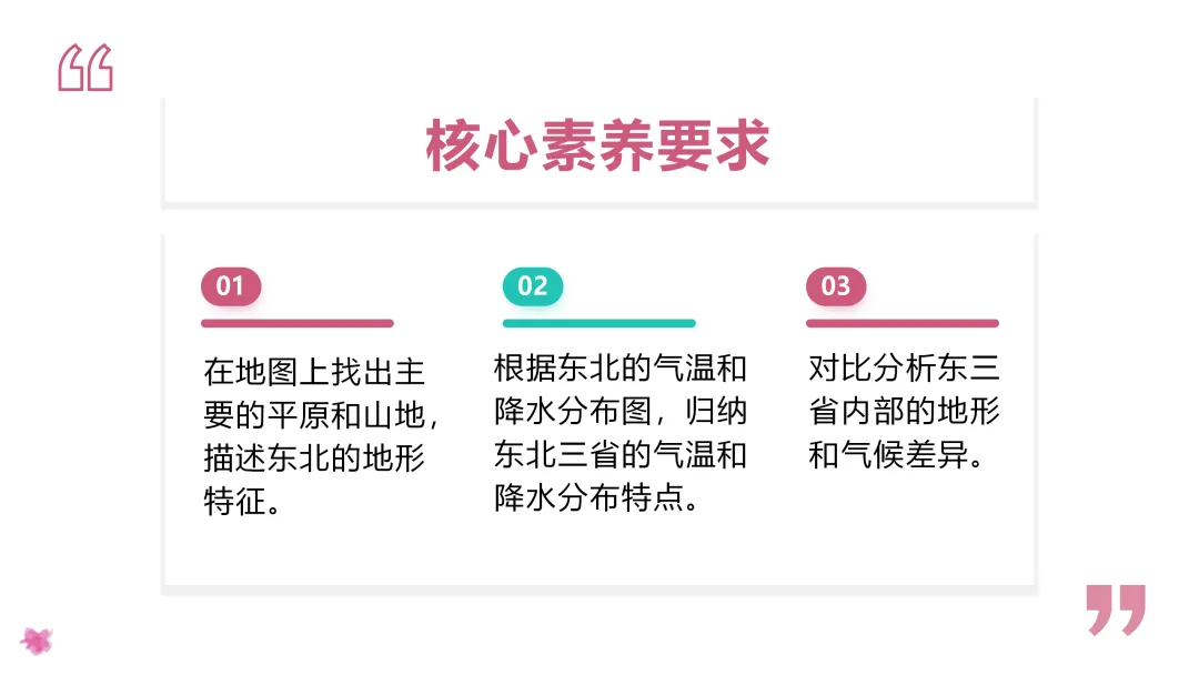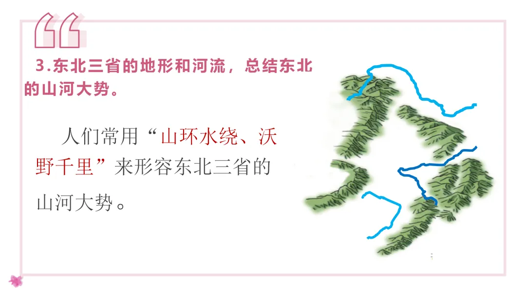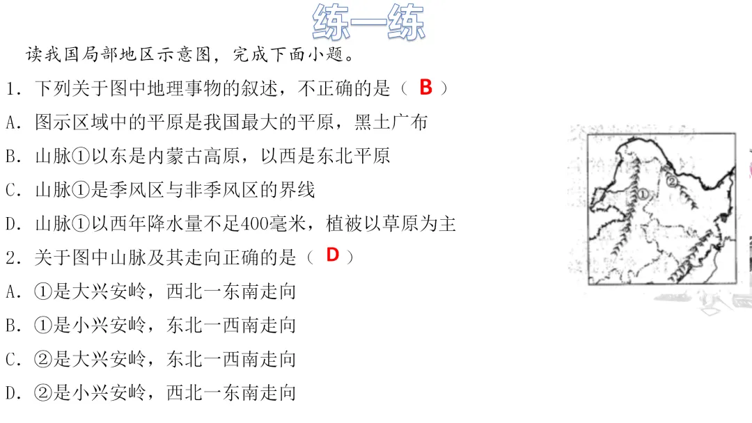 1. 利用地图识记北方的主要山脉、河流、地形区,了解农业特色。
