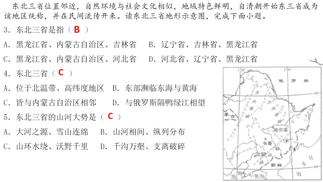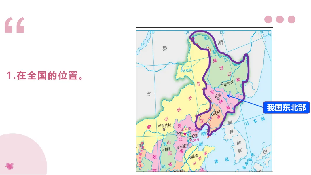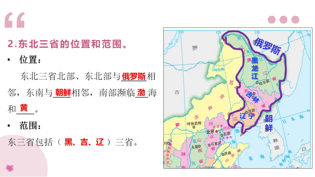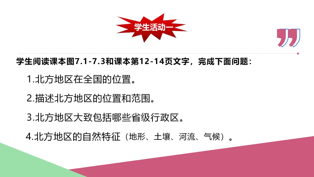 1. 读图描述北方地区的位置、范围。
