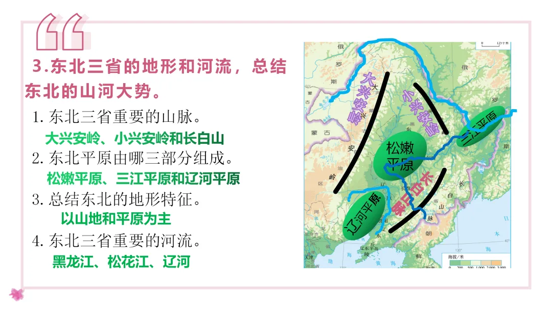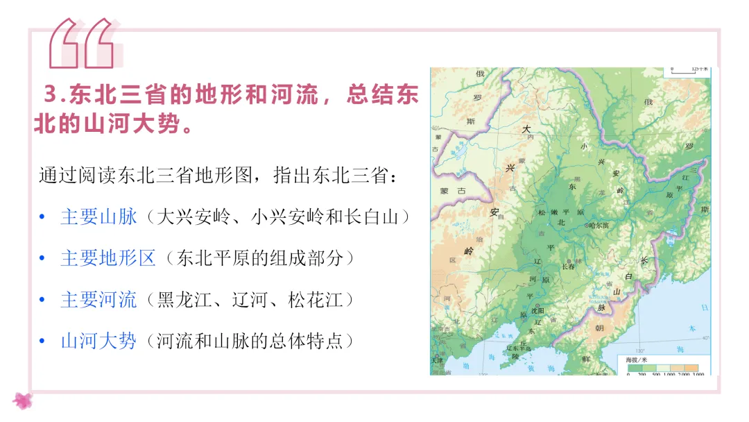 2. 在北方地区地形图上找出本区的主要山脉、河流、地形区。