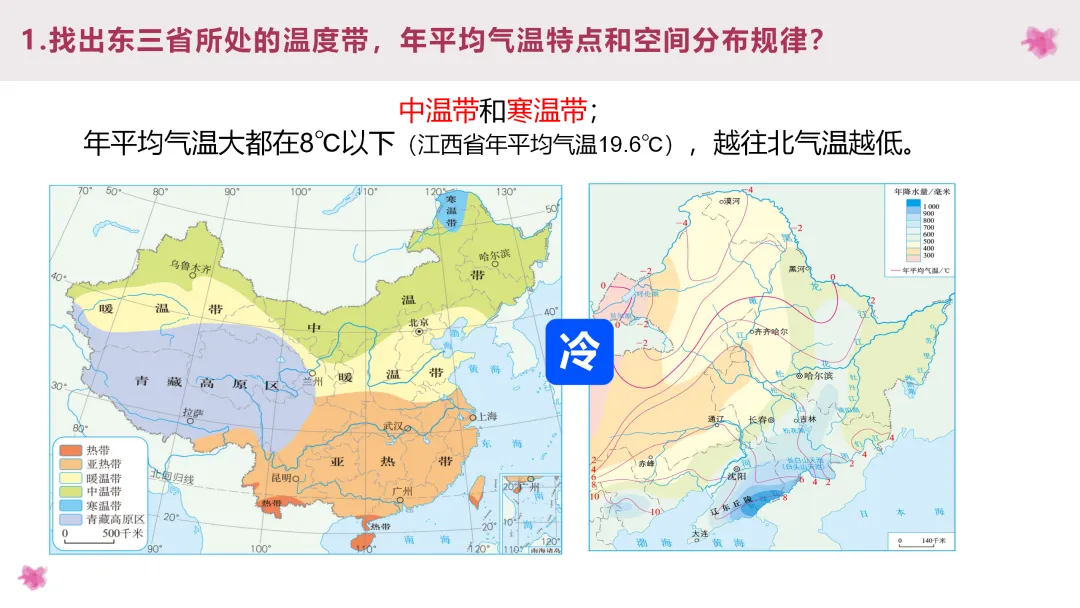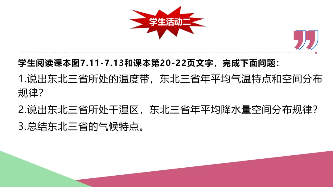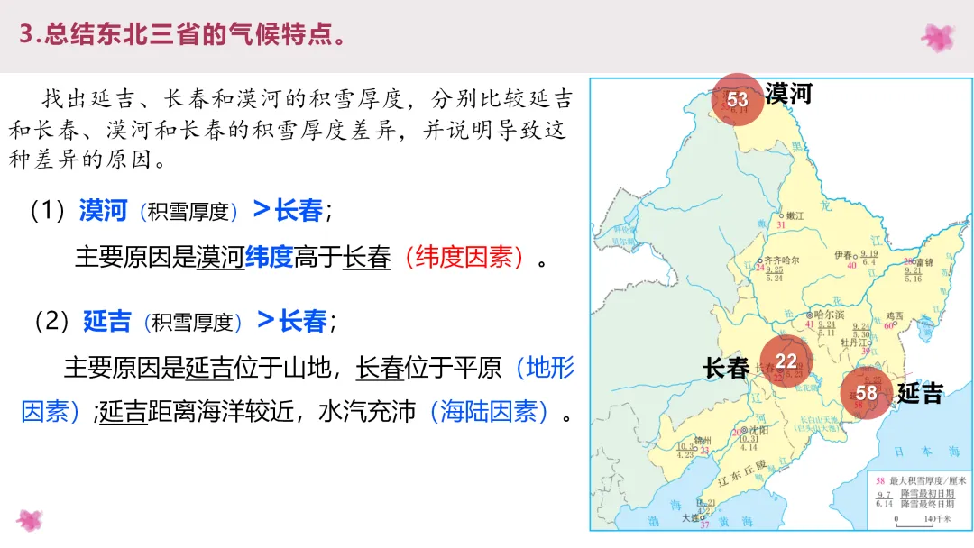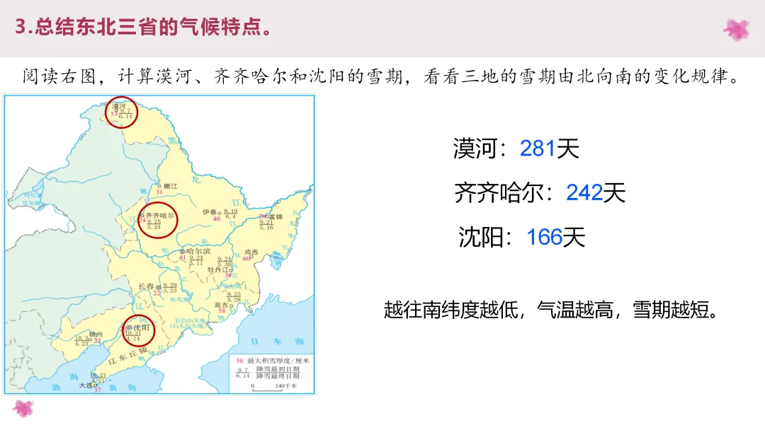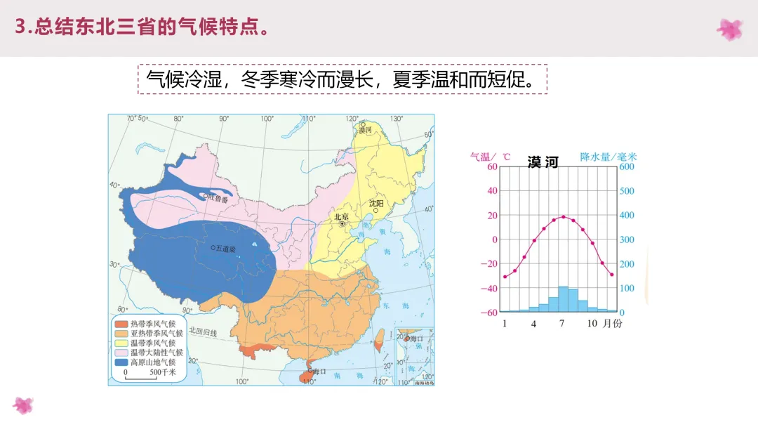 3. 阅读齐齐哈尔、石家庄和延安的气温和降水图,总结北方地区的气候类型和气候特点,阅读课文了解土壤特点,分析气候与土壤对农业的影响。