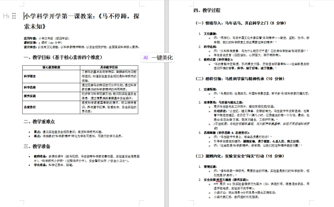 这套教案+PPT的设计超用心,全程以“马”为线索串联整堂课,既贴合马年氛围,又将“奋进、坚韧、协作”的龙马精神融入科学学习,让孩子在趣味探索中种下科学的种子,还能收获成长的力量。从探索任务地图到课后实践任务,环节设计层层递进,逻辑清晰,老师拿来就能用,省心又高效!