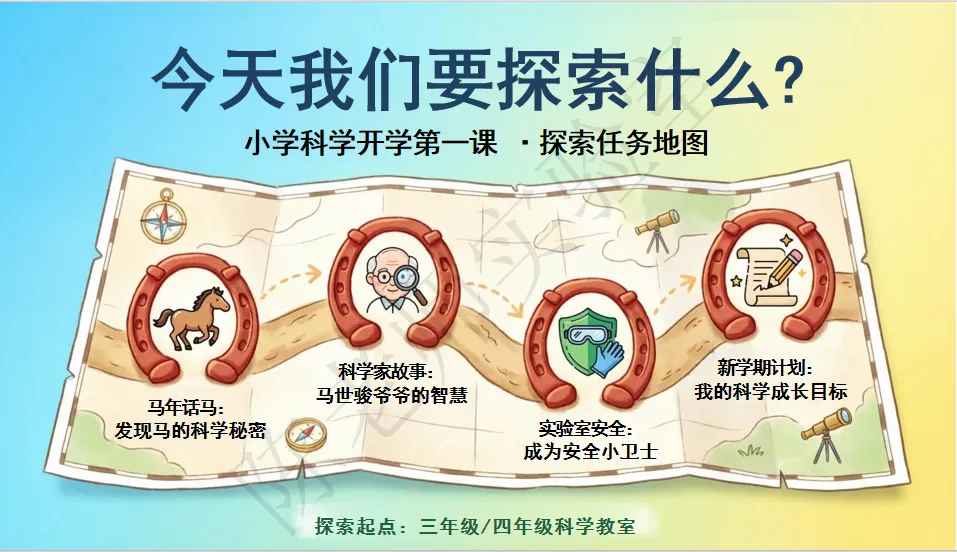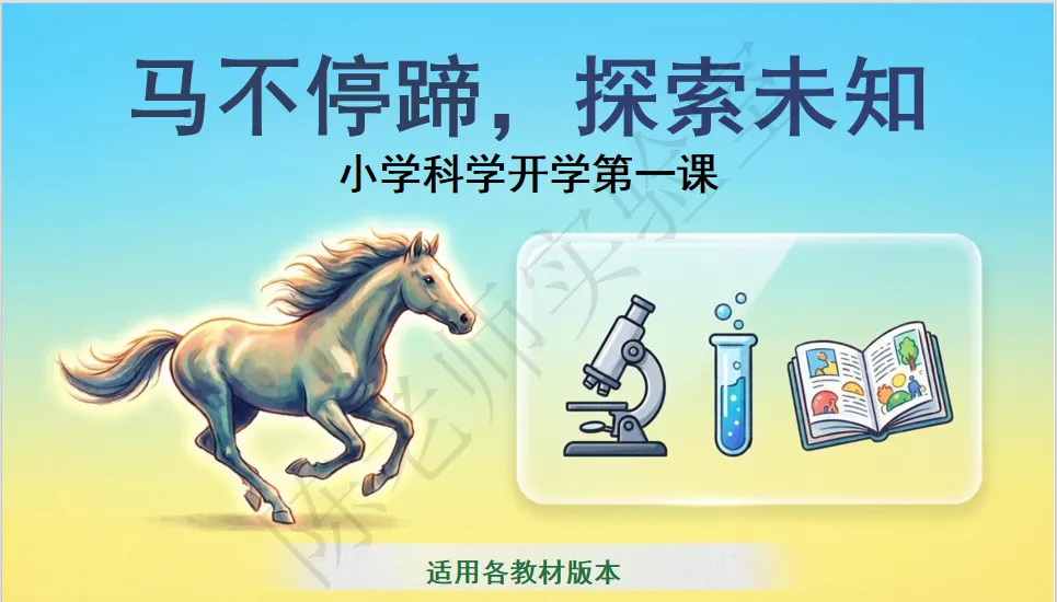 这套以《马不停蹄,探索未知”为主题的小学科学开学第一课教案+PPT,适配各教材版本,把马年趣味、科学知识、榜样精神和实验室安全融于一体,课堂氛围感拉满,赶紧收藏下载,开启新学期的科学探索之旅吧!