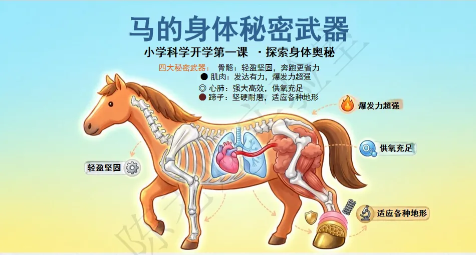 课堂探索从“马的科学秘密”开启,超贴合孩子的好奇心!PPT里带着孩子探究“马为什么跑得快”,拆解出马的骨骼、肌肉、心肺、蹄子四大身体秘密武器,还通过“牙齿磨草料、眼睛长两侧、耳朵能转动”的细节,讲解**结构与功能相适应**的科学小知识,教孩子用“观察+提问+猜想”“解构+观察+联想”的方法发现科学,让孩子明白:科学,始于好奇,成于观察!