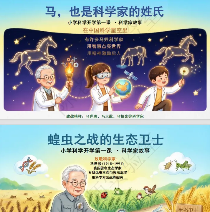 光有趣味知识还不够,榜样的力量更能激励孩子前行。PPT中专门设置了科学家故事板块,聚焦我国著名生态学家**马世骏爷爷**的事迹,讲述他用科学方法战胜蝗灾的故事,展现他踏实、坚持、细致、创新的科学家品质,还介绍了马大猷、马祖光等马姓科学家,让孩子在聆听中汲取“脚踏实地、勇于探索、心系他人”的精神力量,把好奇、责任与坚持装进新学期的精神行囊。