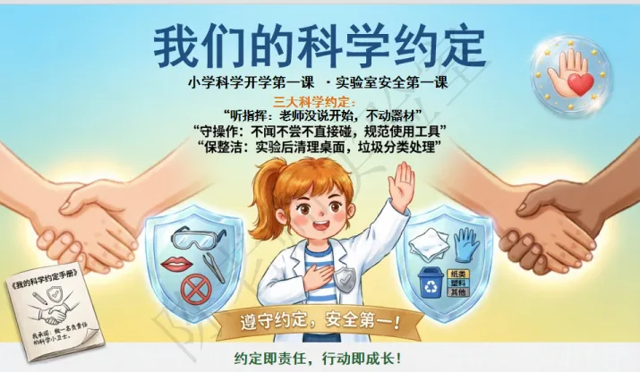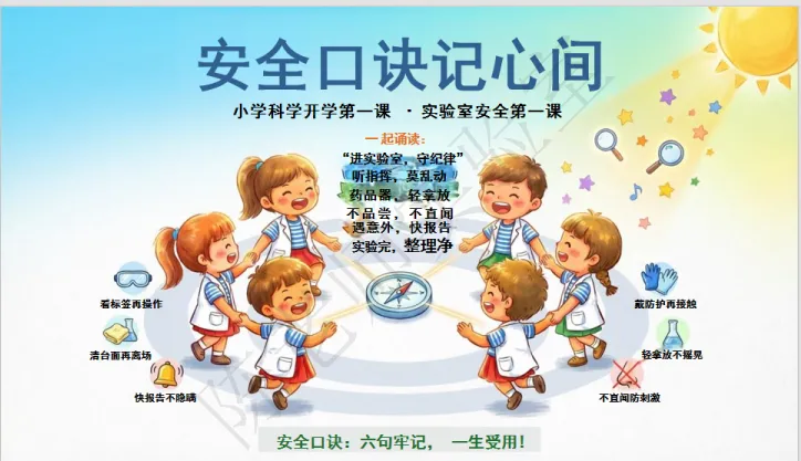 科学探索,安全为先!这套PPT把实验室安全作为重点内容,打造专属“安全小卫士”课堂。从安全口诀“看标签、戴防护、守步骤、清台面”,到六句核心安全准则诵读,再到“火眼金睛找隐患”互动环节,列举湿手碰电源、奔跑打闹、混合药品等危险行为及后果,还设计了意外情景应对指南,教孩子用“观察→思考→提醒→改正”四步法规避风险,更制定了三大科学约定,让孩子从开学第一课就树立规范操作的安全意识,掌握探索的“护身符”。