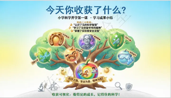 课堂的结尾设计也超暖心,既有学习成果小结,让孩子梳理“认识马的科学智慧、学习科学家精神、掌握实验室安全法宝”三大收获,更布置了贴合生活的课后实践任务:当家庭安全小讲师演示安全三字经,观察身边动植物并记录有趣特征,真正实现“讲出来、画下来、问到底,让科学走进生活每一刻”。