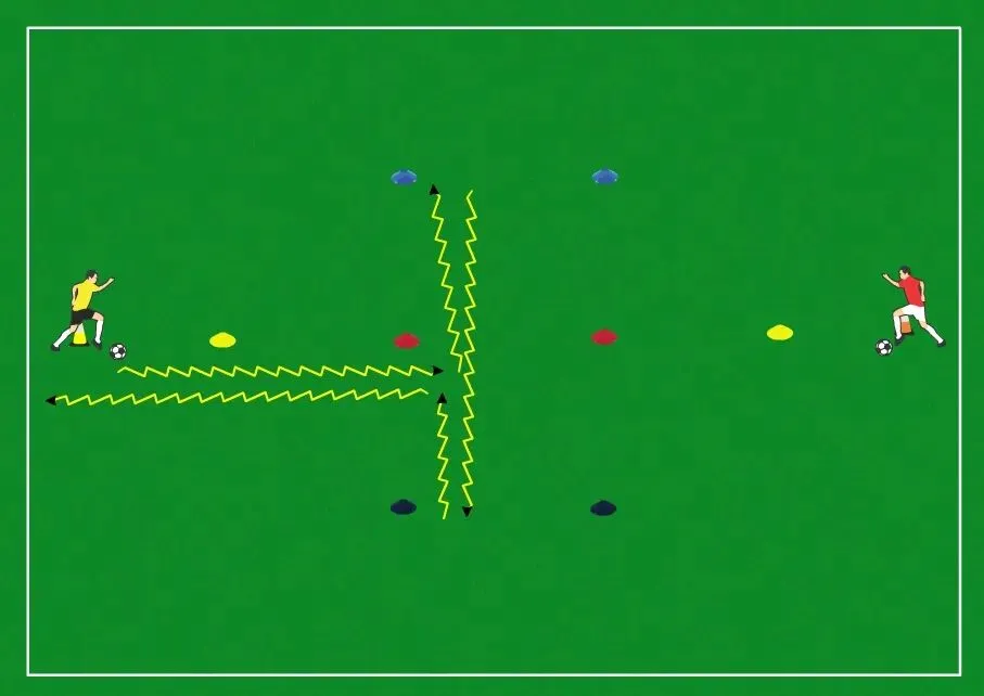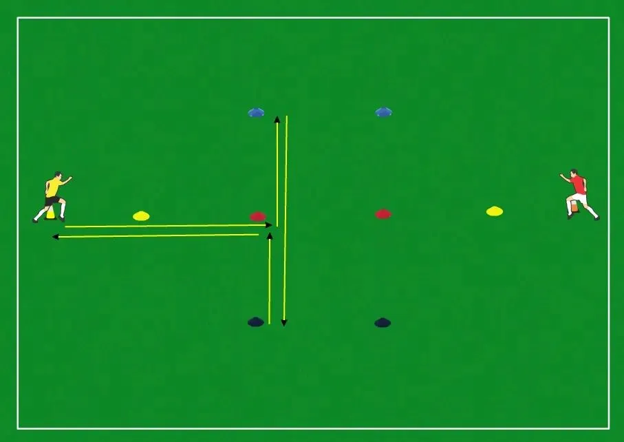 1. 按标志碟颜色跑动,每个标志碟的距离5米,顺序:黄-红-蓝-黑-红-黄