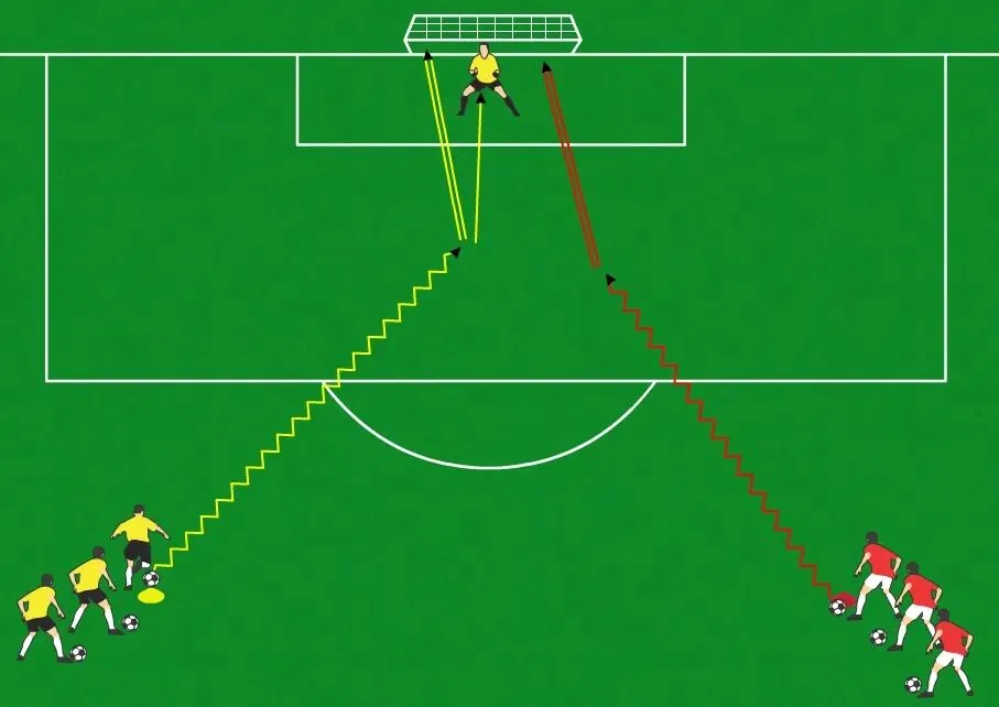 2. 黄队第一名队员先带球、到门前5-8米的位置射门,射门完成后,直接变成守门员,此时,红队的队员开始带球向球门冲来,红队的队员完成射后后,也变成守门员,接着守黄队第二个队员的射门,依次循环练习