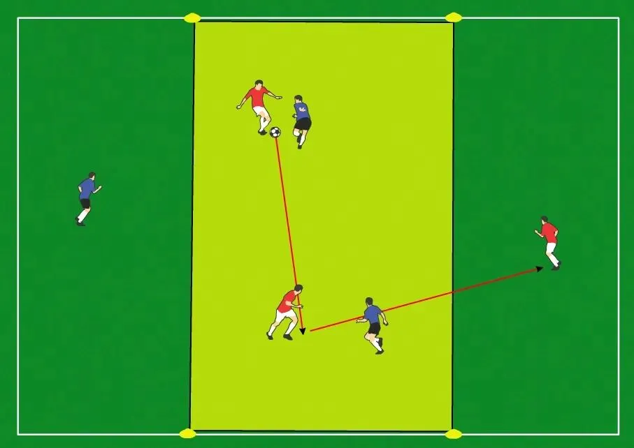 2. 主要的对抗区域在中间部分,中间部分的球员在练习过程中,每隔3-4分钟与两端的球员交换