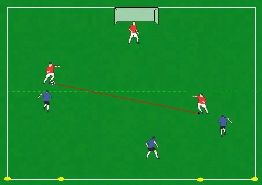 2. 3V3的练习,红队防守一个球门,蓝队防守两个标志碟的小门(四个标志碟摆放的小门,小门的距离与对手的球门一样宽度)