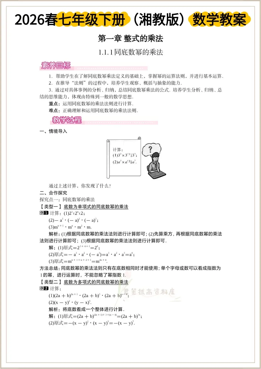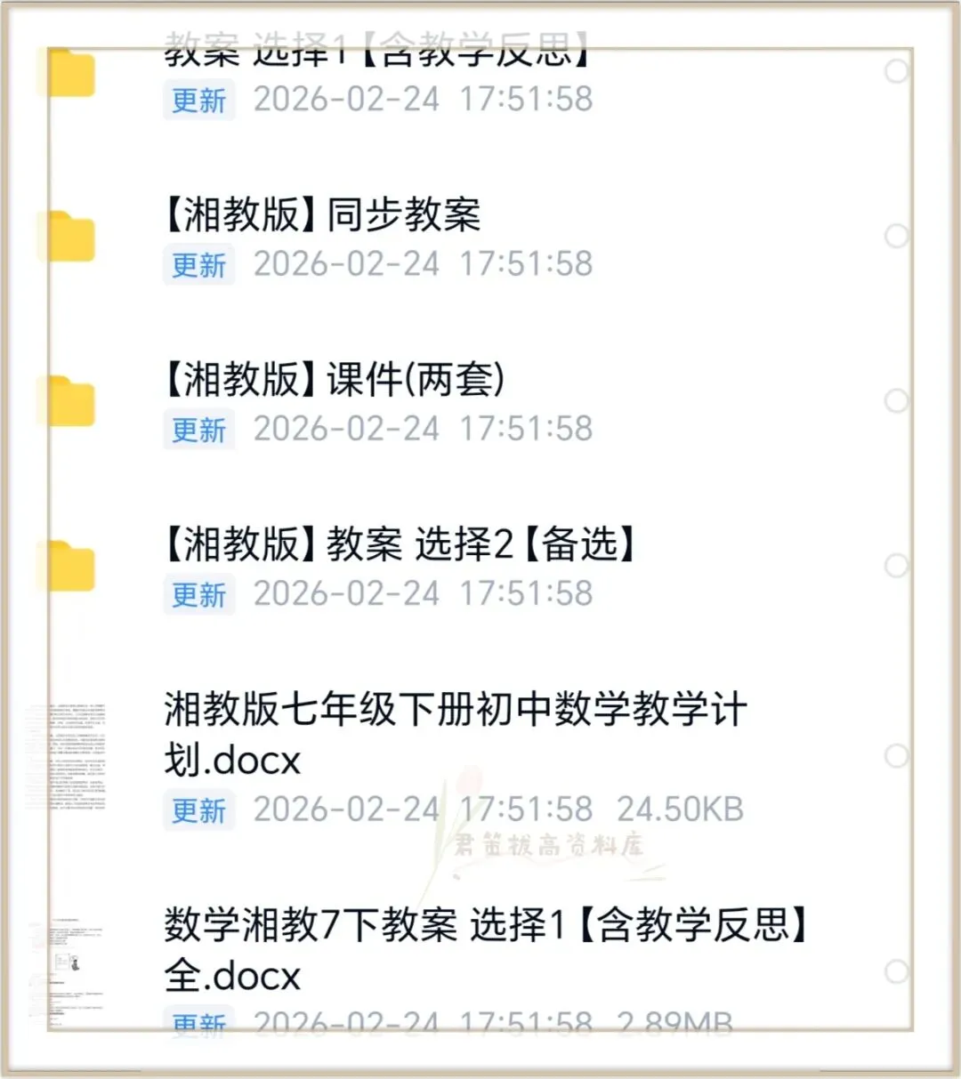 今日老师精心给大家整理了:2026春新(湘教版)七年级下册数学教案+课件+教学设计+习题课件(全套),完整电子版可打印!