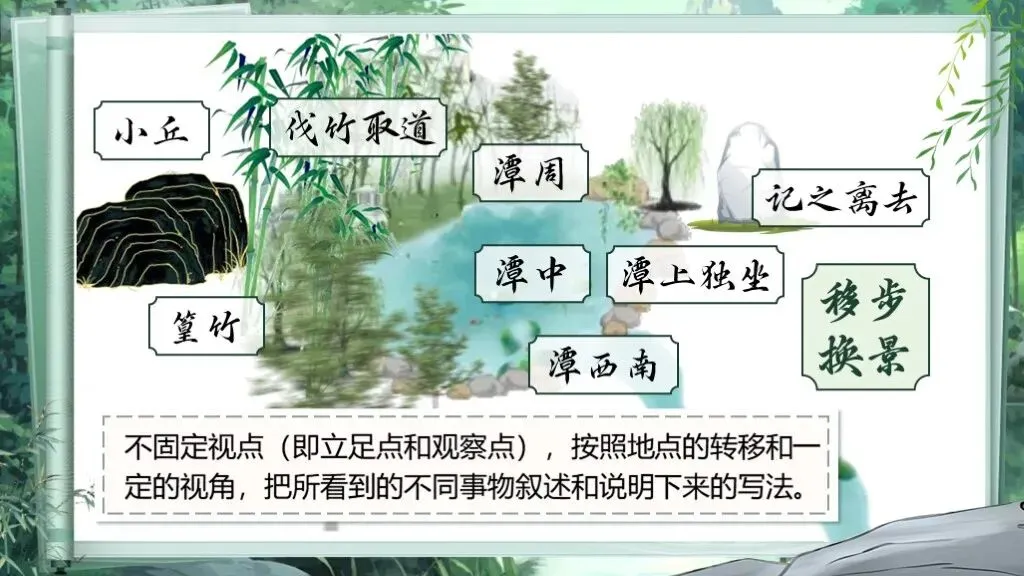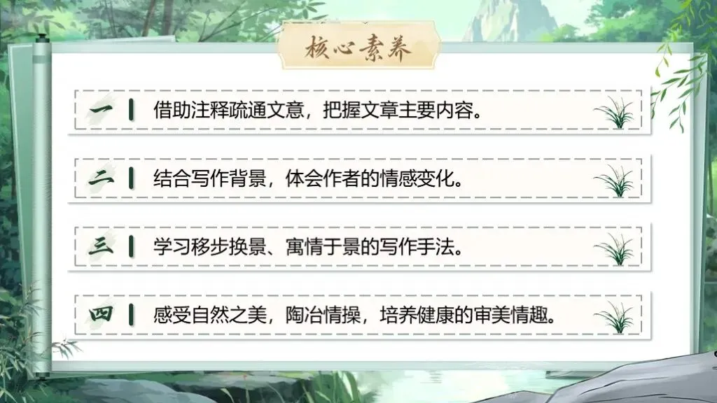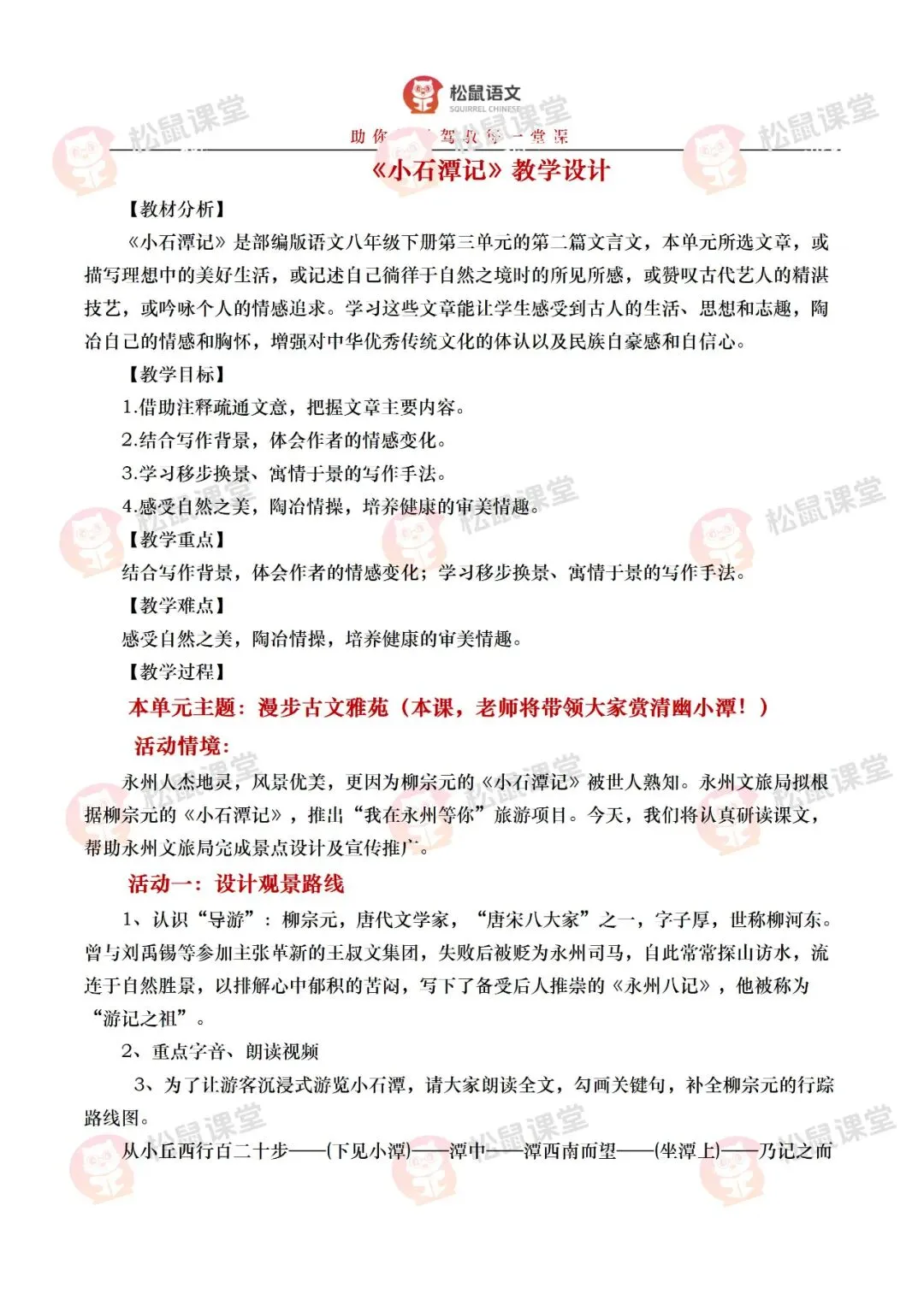《小石潭记》是部编版语文八年级下册第三单元的第二篇文言文,本单元所选文章,或描写理想中的美好生活,或记述自己徜徉于自然之境时的所见所感,或赞叹古代艺人的精湛技艺,或吟咏个人的情感追求。学习这些文章能让学生感受到古人的生活、思想和志趣,陶冶自己的情感和胸怀,增强对中华优秀传统文化的体认以及民族自豪感和自信心。