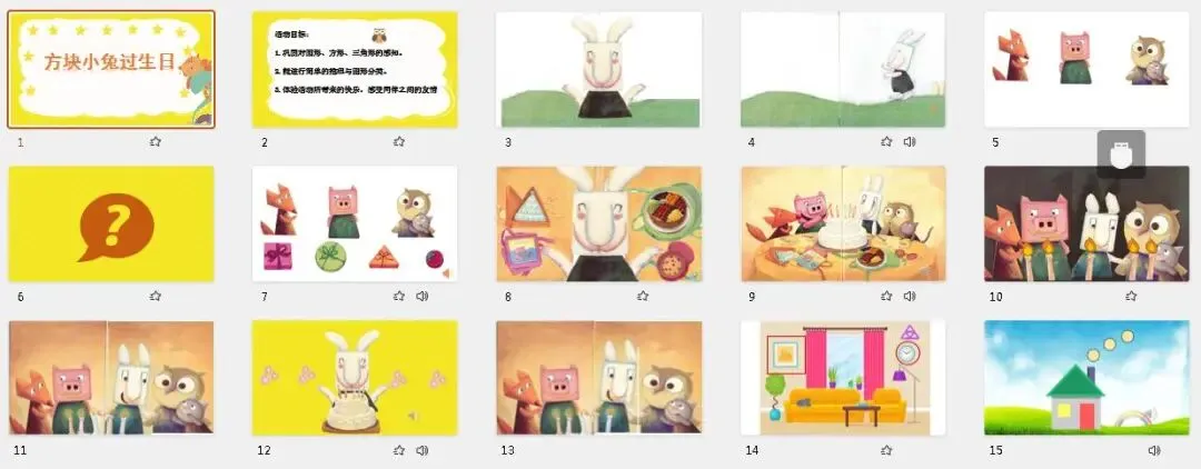 师:收到礼物的方块兔可高兴了,于是它端出了生日蛋糕,快乐的点起了蜡烛,让我们一起唱起生日歌。