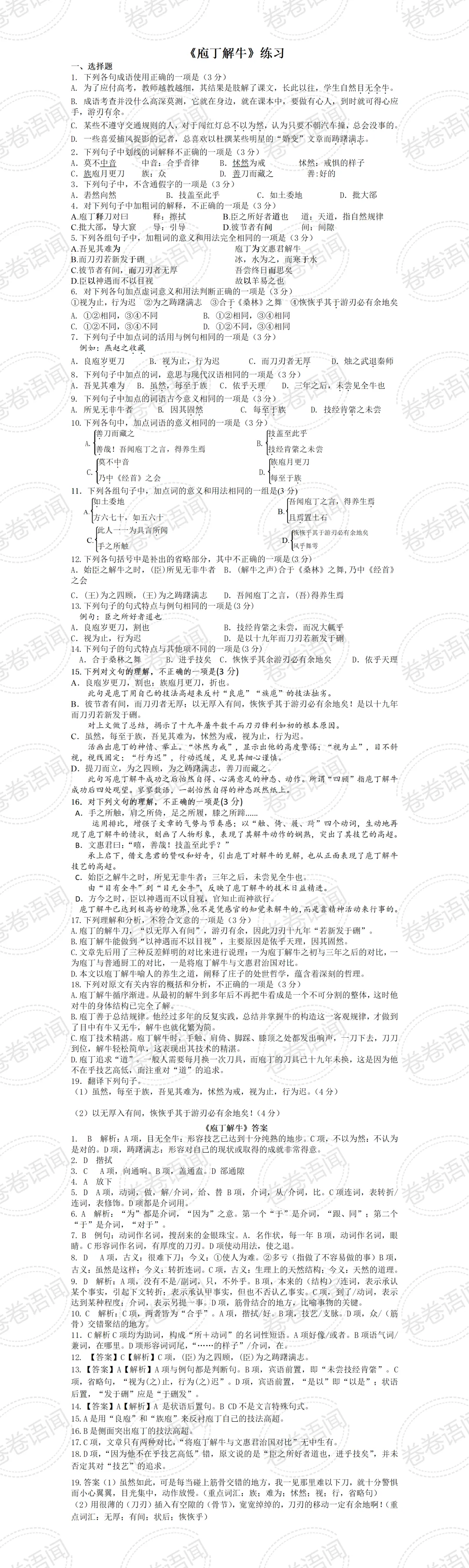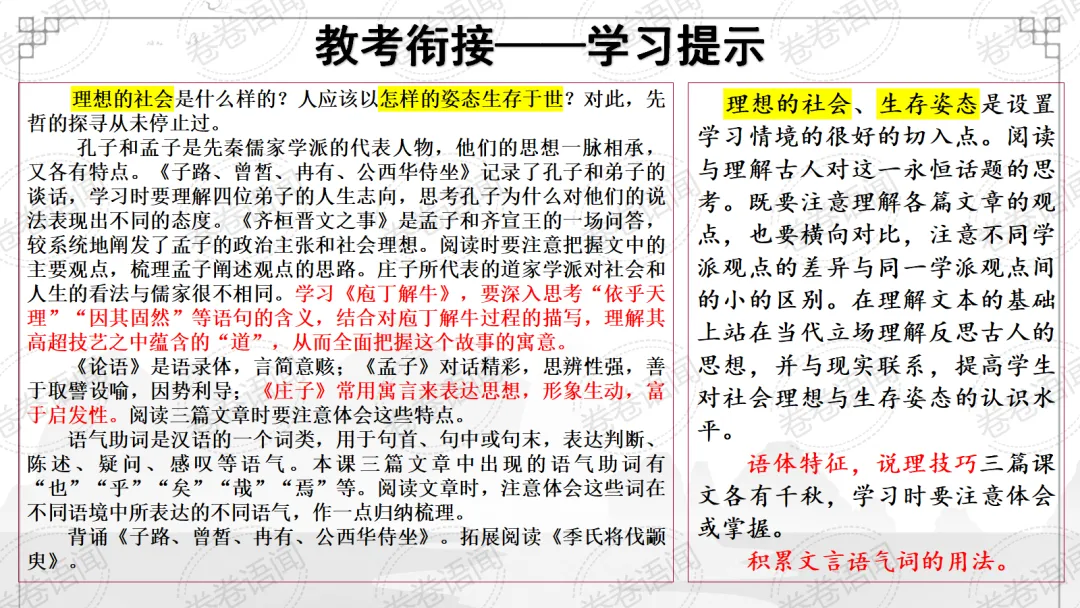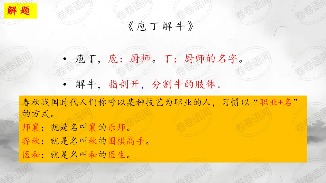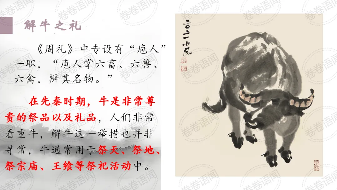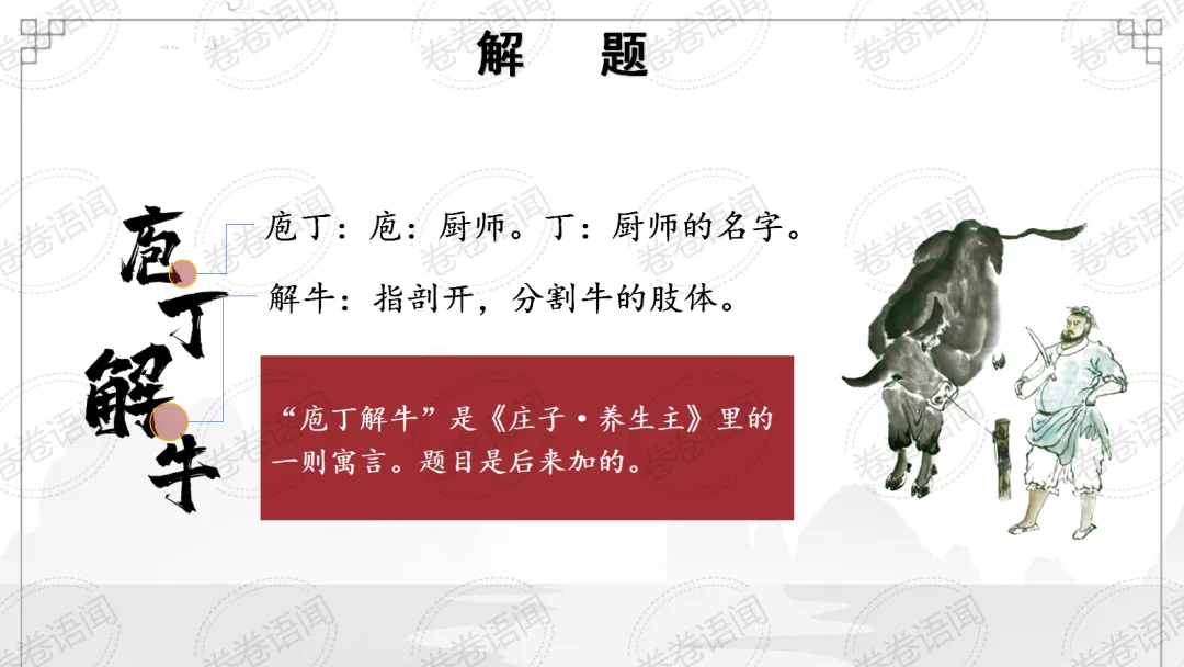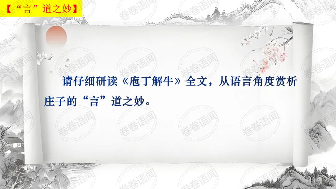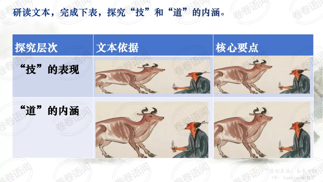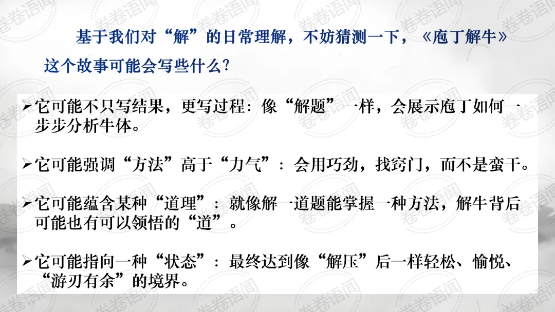 情境导入:结合春秋战国乱世背景,对比儒道两家核心主张,引出庄子及《庖丁解牛》;以 “解牛为何非杀牛 / 宰牛” 设疑,引导理解 “解” 的深层含义,激发探究兴趣。