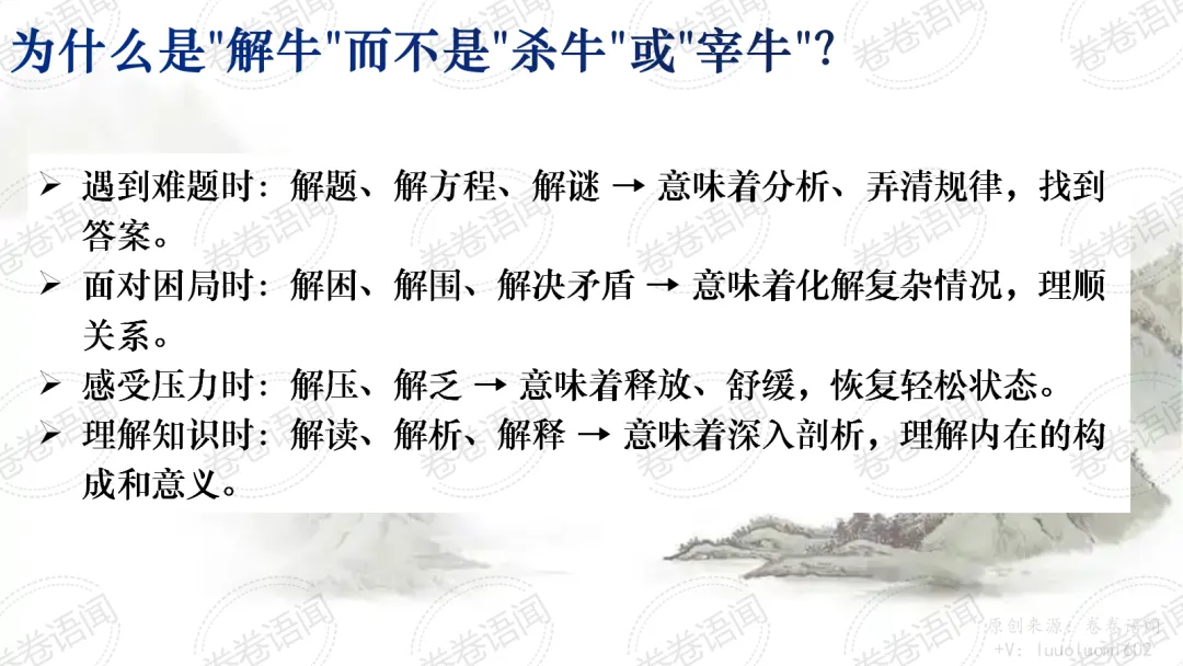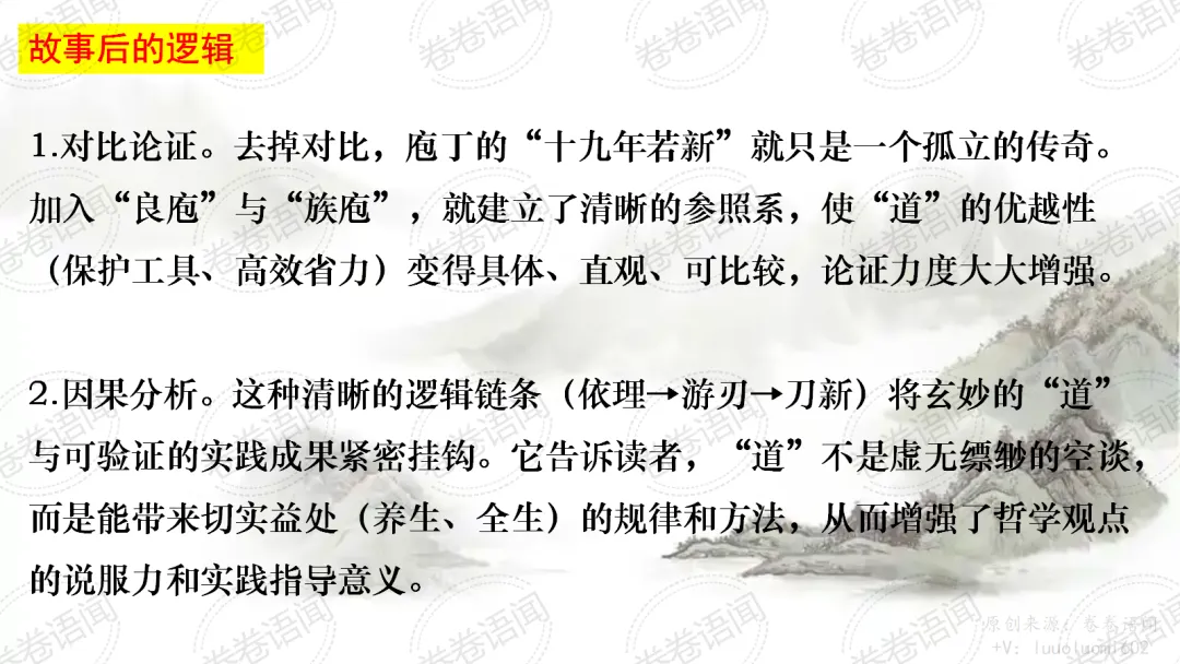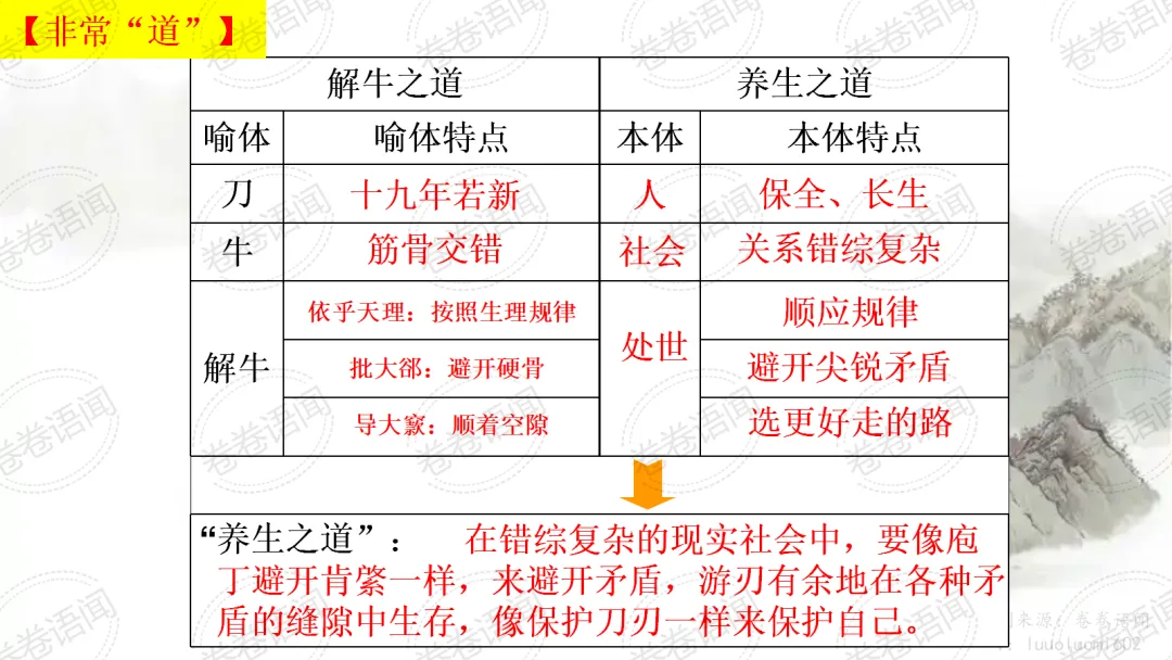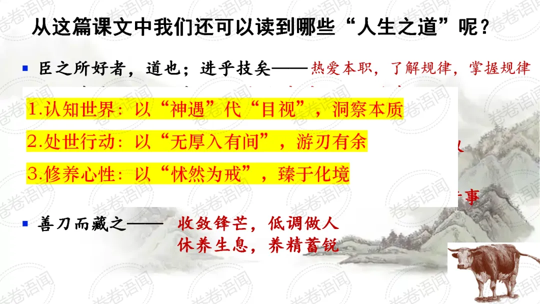悟理探旨:梳理解牛之道与养生之道的比喻对应关系,明确核心隐喻;结合文本语句拓展探究故事蕴含的人生之道,联系现实理解其当代价值。