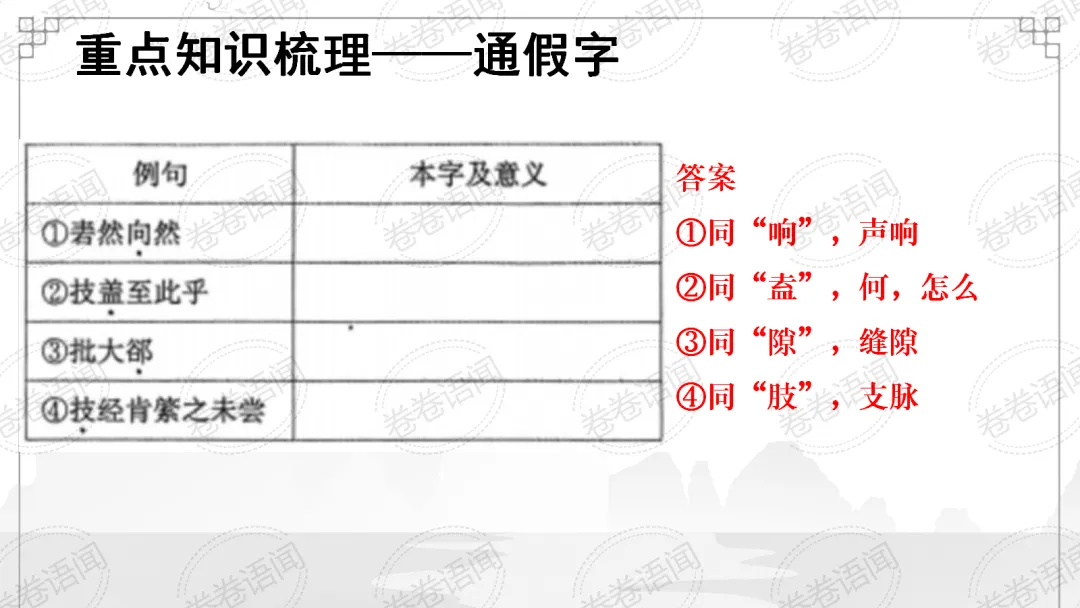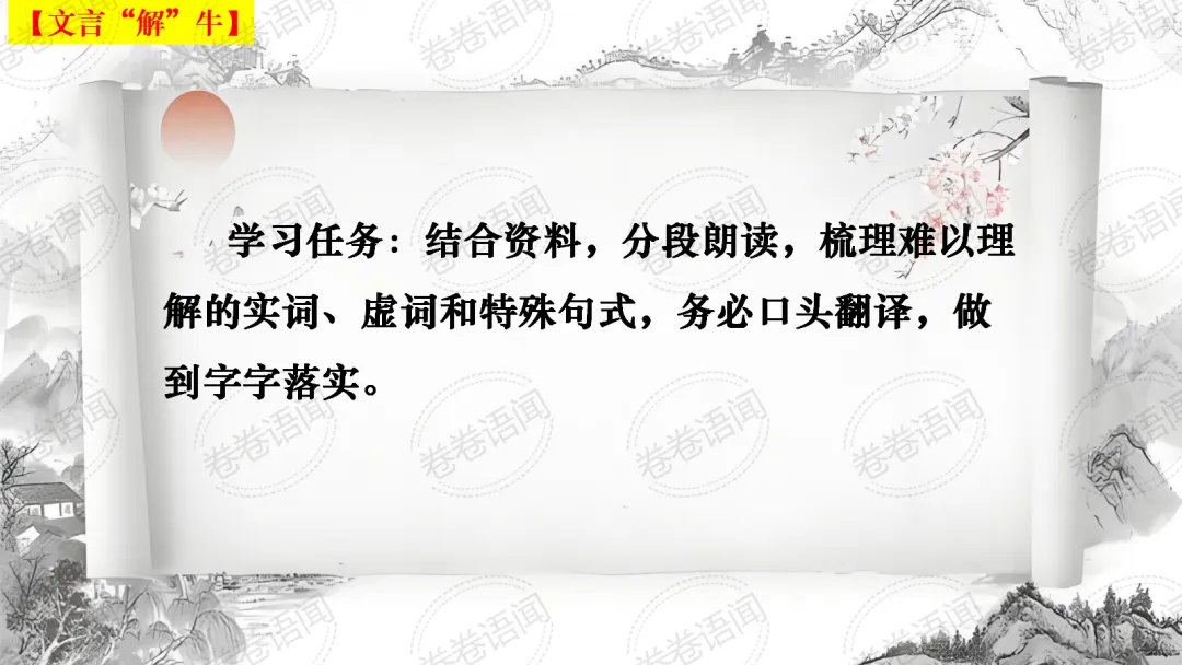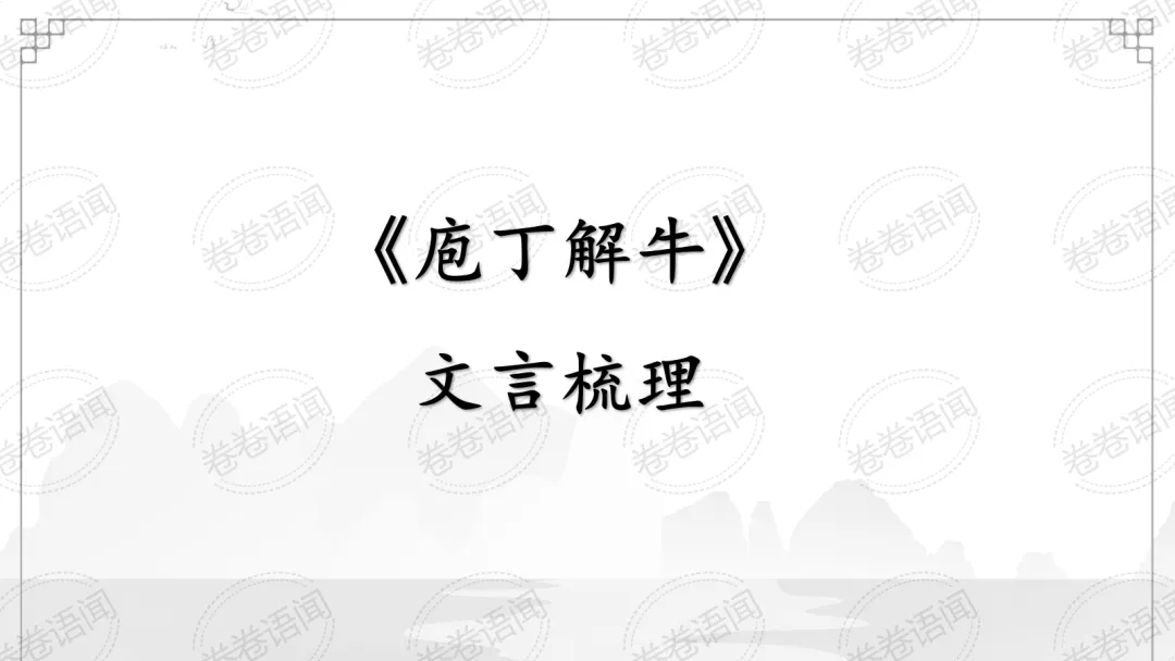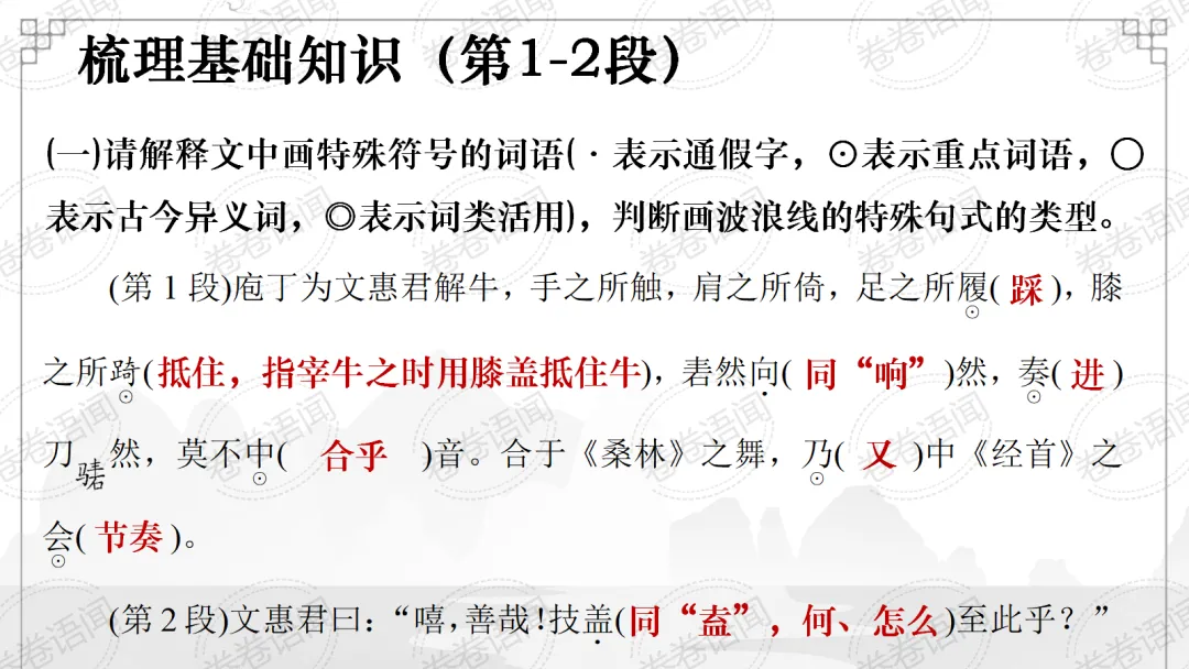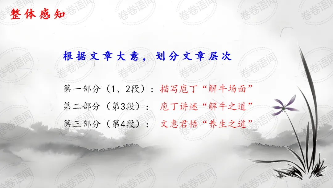 初读文本:学生齐读正音,梳理重点实词、虚词、特殊句式,完成重点语句口头翻译;划分文章层次,明确解牛场面、解牛之道、养生之道三部分内容。