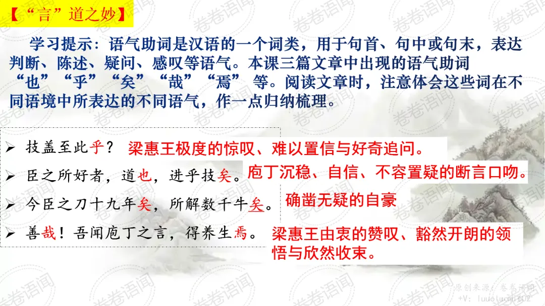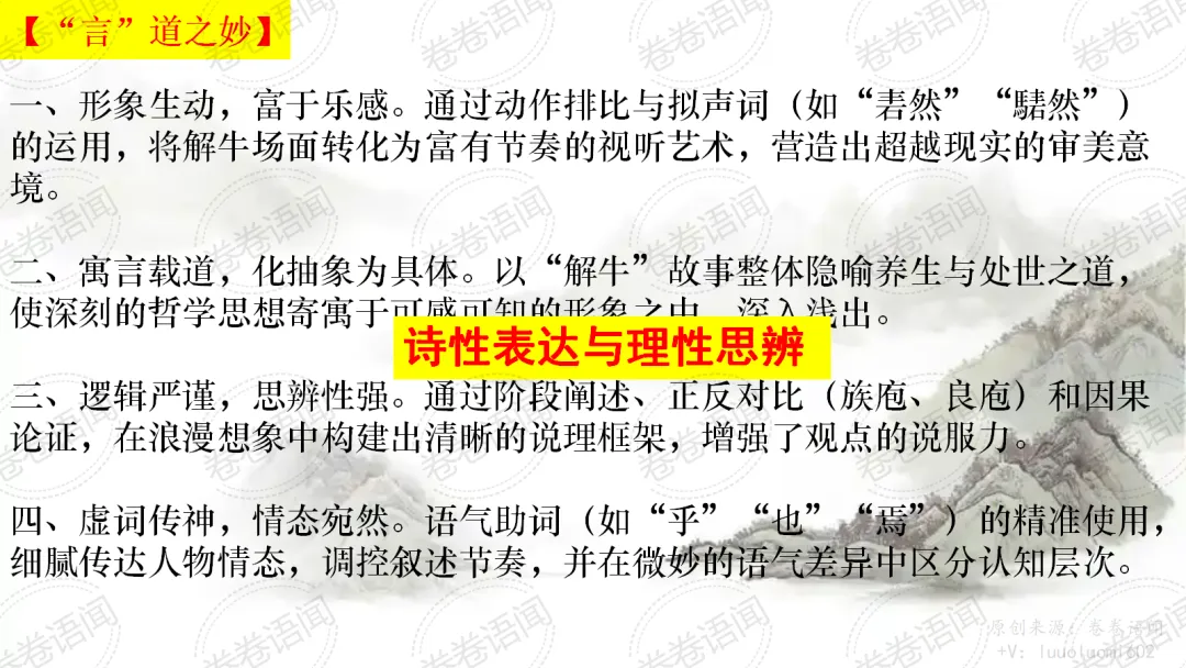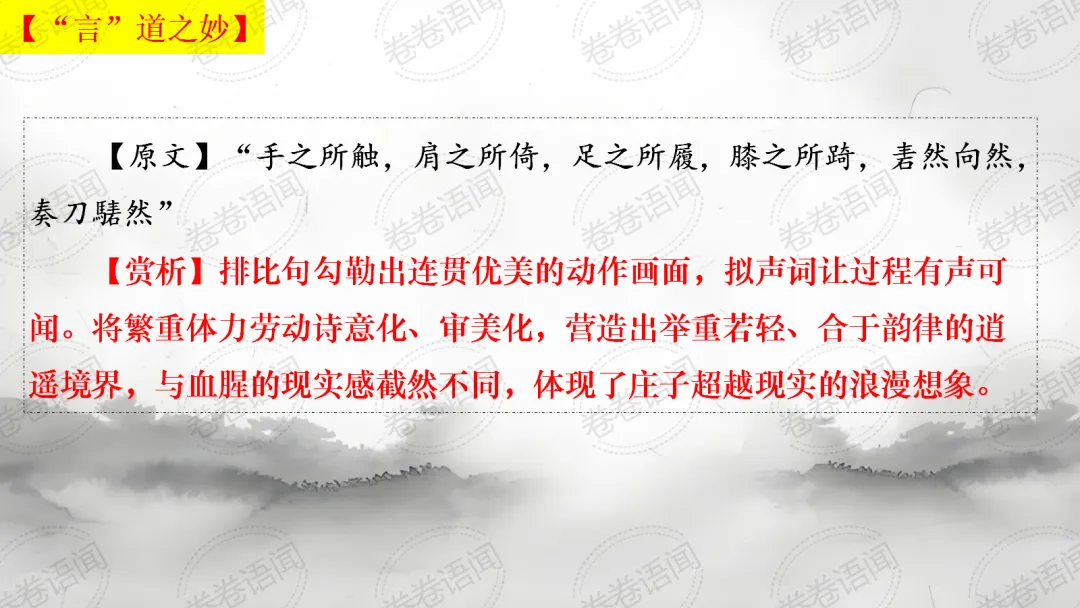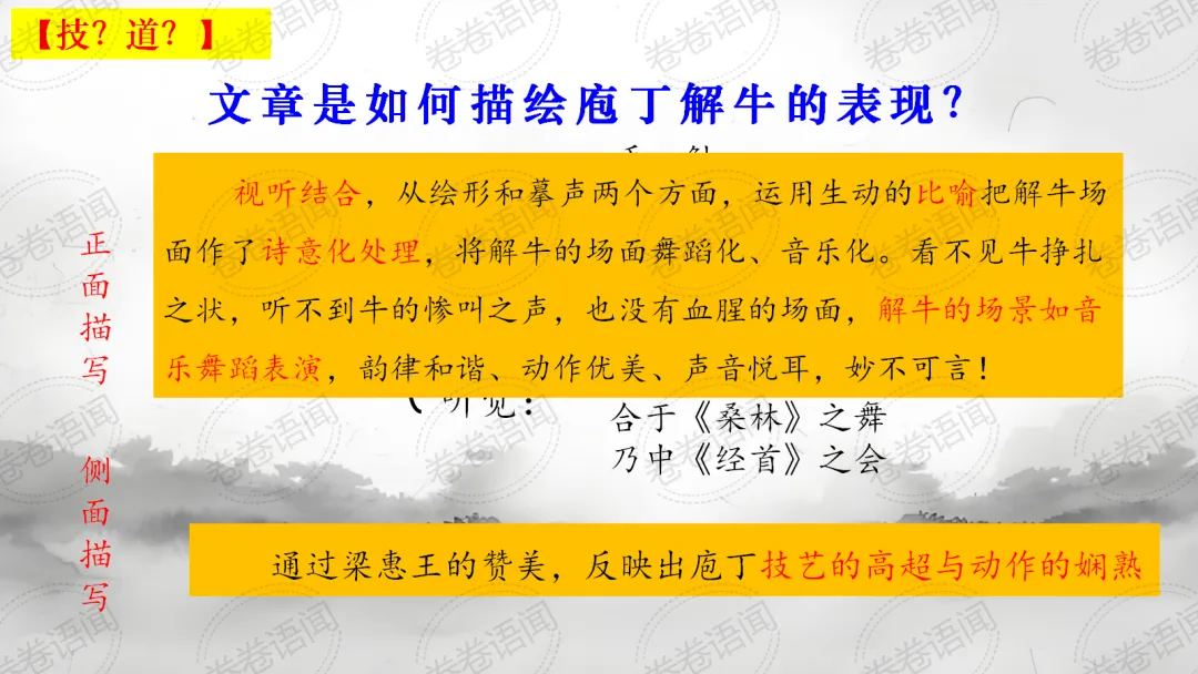 品读析技:从视听角度赏析庖丁解牛的场面描写,分析正面动作刻画 + 侧面梁惠王赞叹的写作手法,体会解牛过程的舞蹈化、音乐化特点。