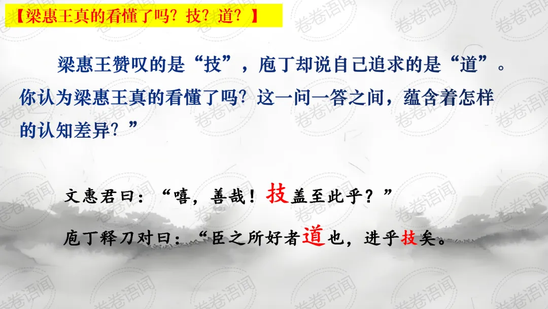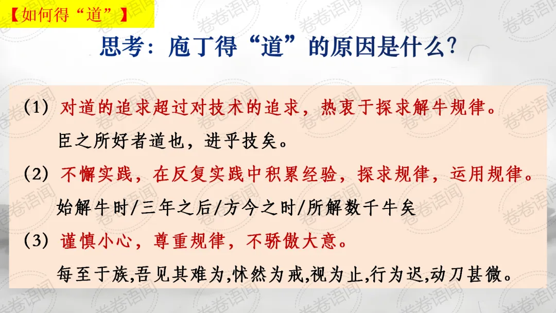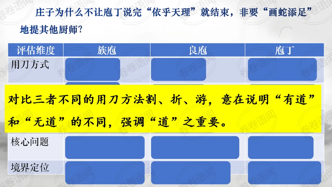 探微析道:对比分析 “技” 与 “道” 的内涵,梳理庖丁得 “道” 的三重境界;对照族庖、良庖、庖丁的用刀方式,探究三者境界差异,总结庖丁得 “道” 的原因。