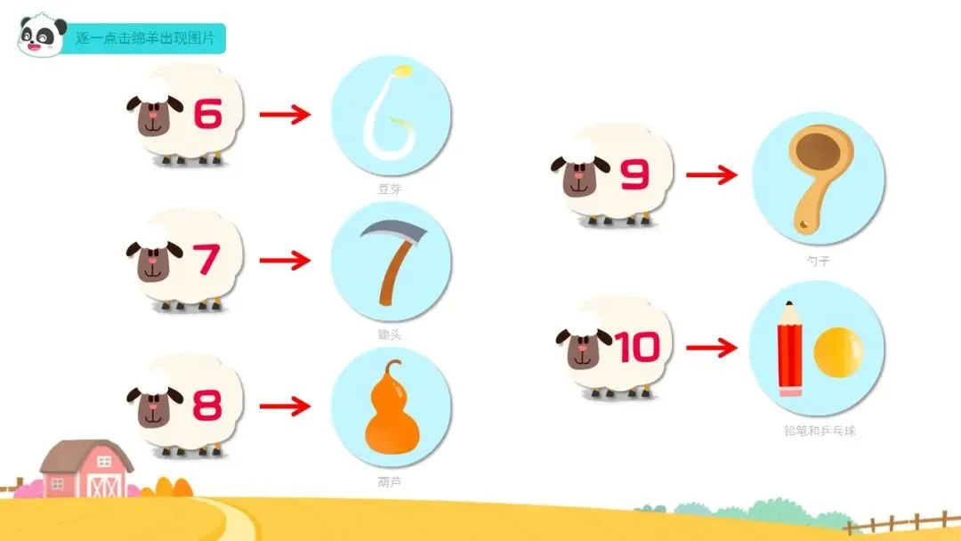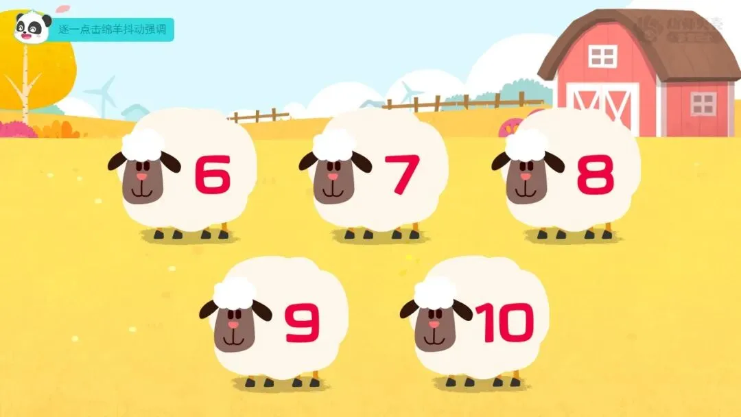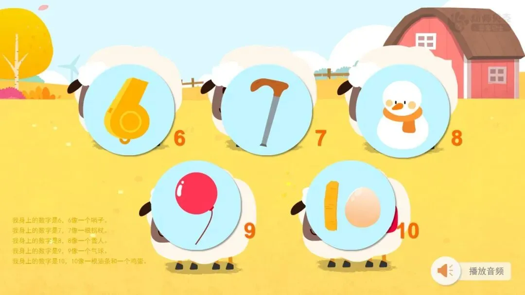播放音频及图片“数字绵羊6-10”,引导幼儿认识数字6-10。