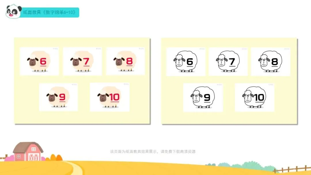 环境准备:随机打印纸面教具《数字绵羊6-10》,每位幼儿一张,提前放置于幼儿座位下。