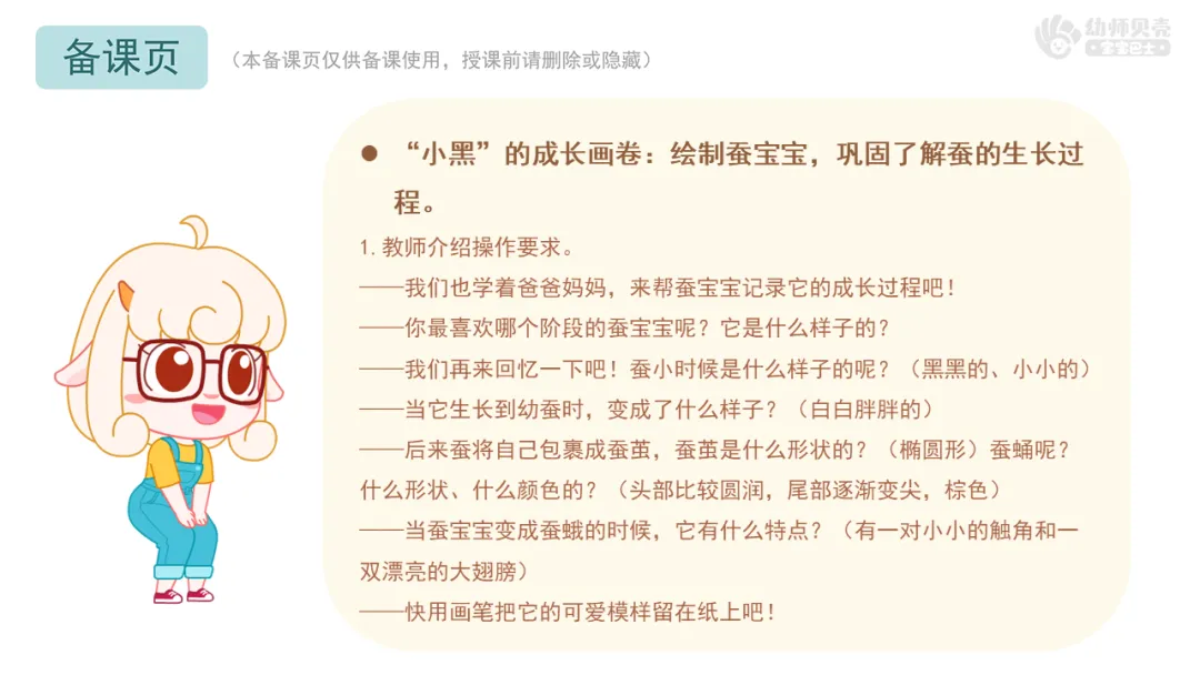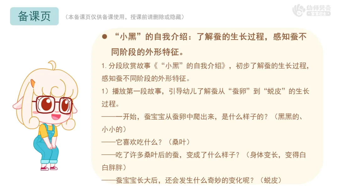 1.分段欣赏故事《“小黑”的自我介绍》,初步了解蚕的生长过程,感知蚕不同阶段的外形特征。