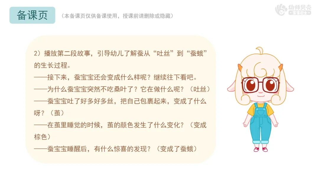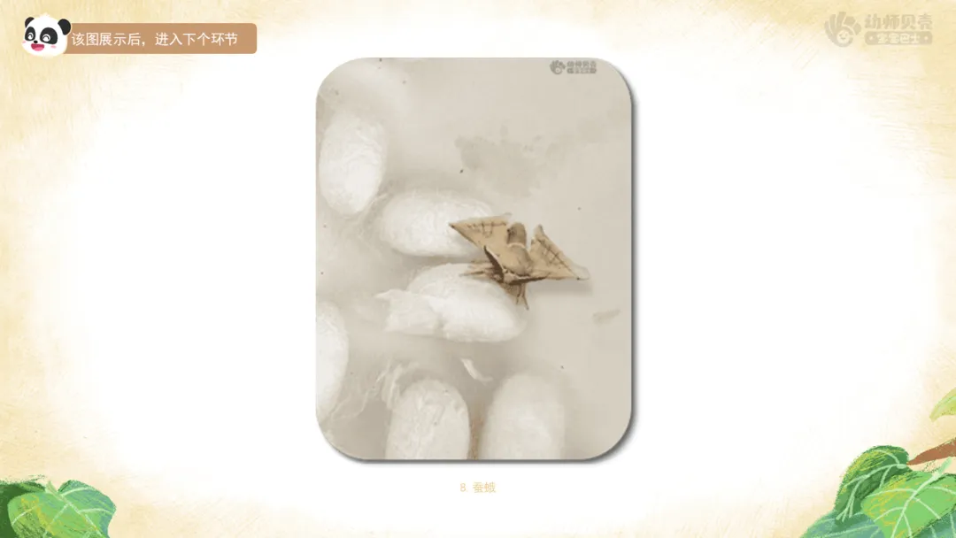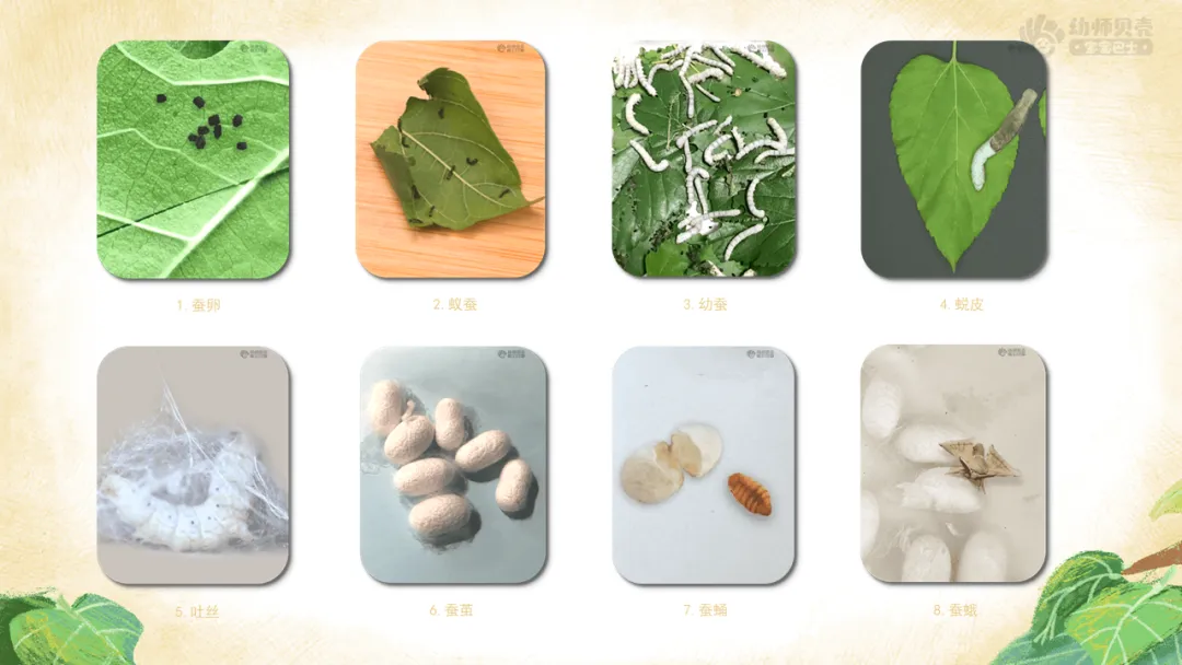 2)引导幼儿了解蚕从“吐丝”到“蚕蛾”的生长过程。