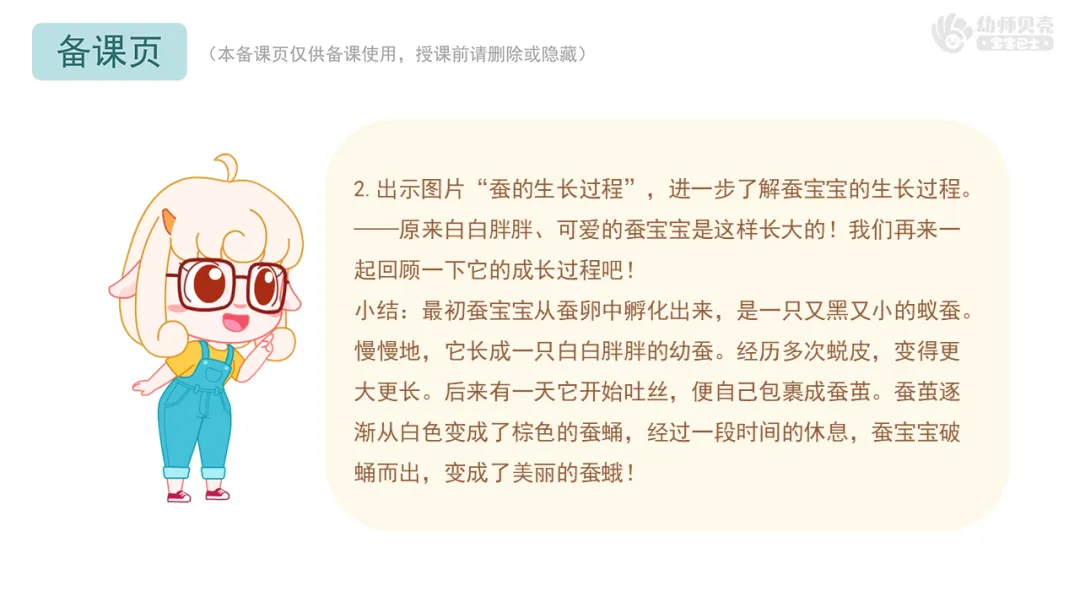 l重点:了解蚕宝宝的生长过程及各阶段外形特征。