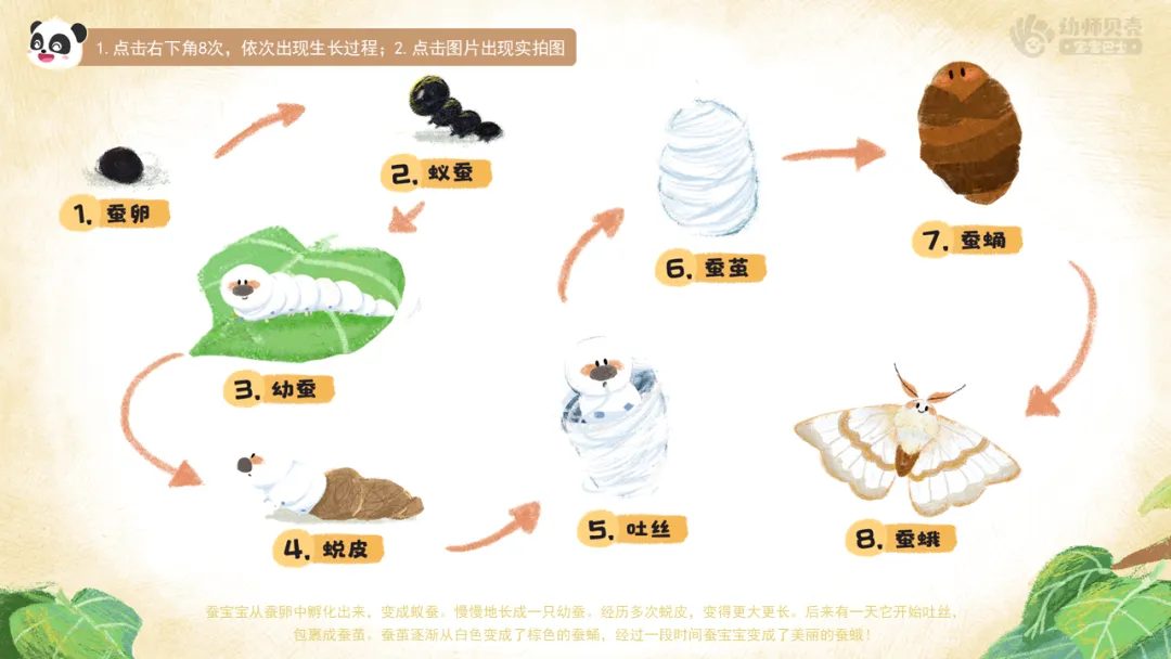 小结:最初蚕宝宝从蚕卵中孵化出来,是一只又黑又小的蚁蚕。慢慢地,它长成一只白白胖胖的幼蚕。经历多次蜕皮,变得更大更长。后来有一天它开始吐丝,便自己包裹成蚕茧。蚕茧逐渐从白色变成了棕色的蚕蛹,经过一段时间的休息,蚕宝宝破蛹而出,变成了美丽的蚕蛾!