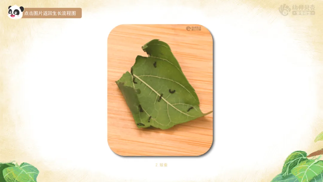 1)引导幼儿了解蚕从“蚕卵”到“蜕皮”的生长过程。