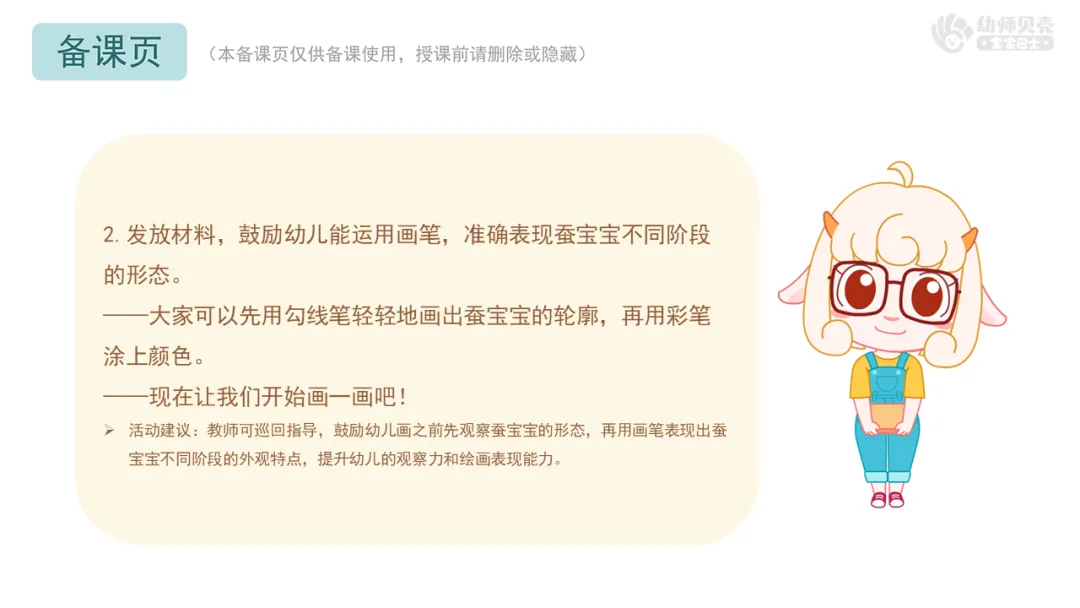 Ø活动建议:教师可巡回指导,鼓励幼儿画之前先观察蚕宝宝的形态,再用画笔表现出蚕宝宝不同阶段的外观特点,提升幼