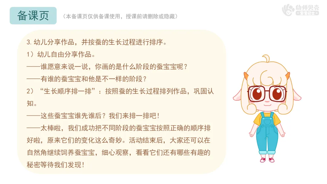 ——太棒啦,我们成功把不同阶段的蚕宝宝按照正确的顺序排好啦,原来它们的变化这么奇妙。活动结束后,大家还可以在自然角继续饲养蚕宝宝,细心观察,看看它们还有哪些有趣的秘密等待我们发现!