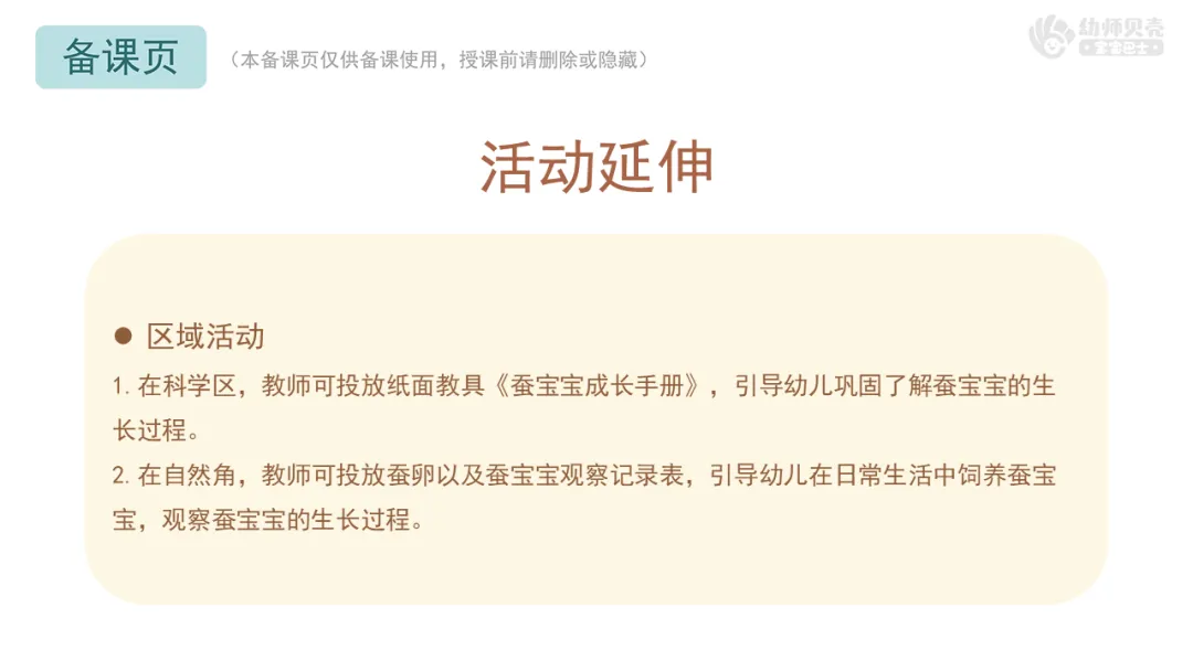 1.在科学区,教师可投放纸面教具《蚕宝宝成长手册》,引导幼儿巩固了解蚕宝宝的生长过