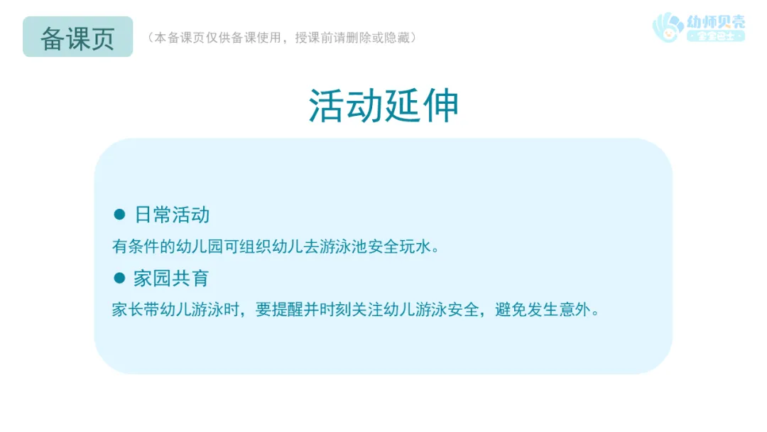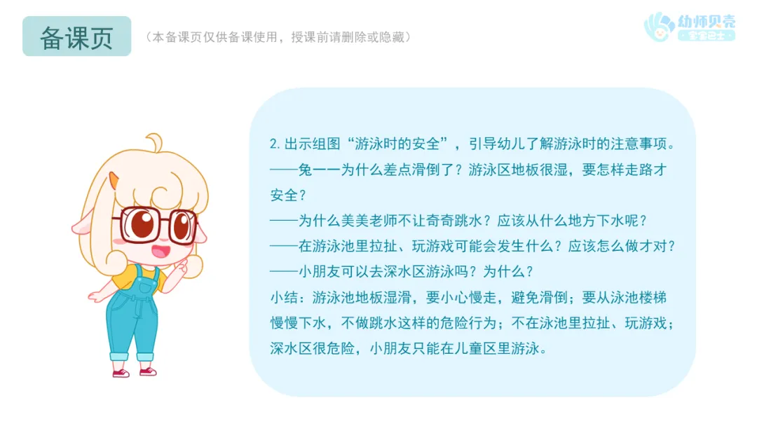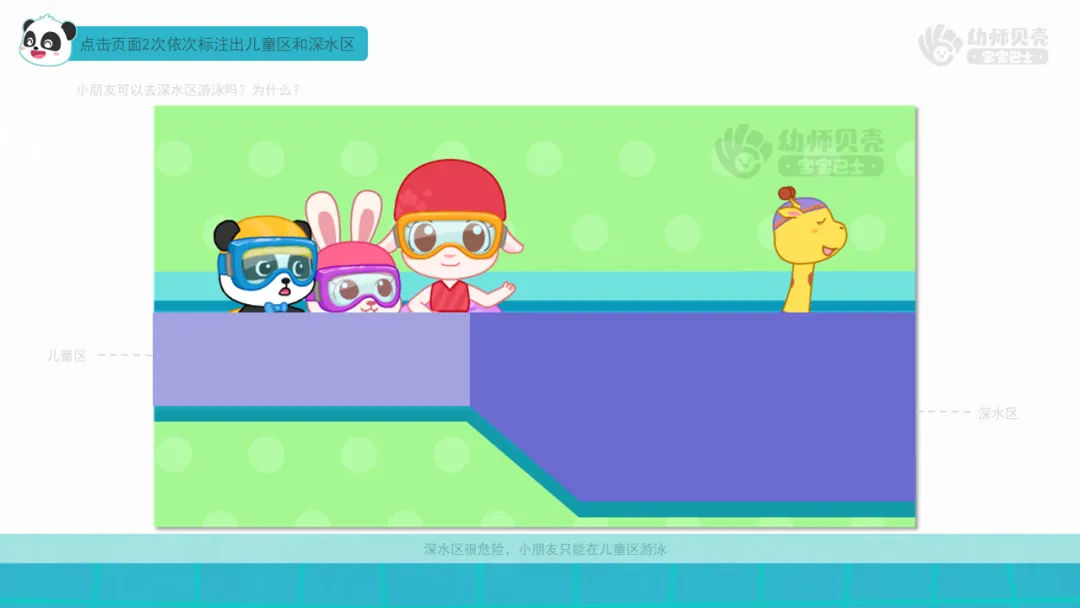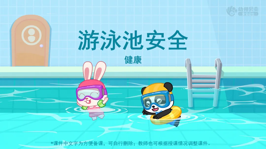 小结:游泳池地板湿滑,要小心慢走,避免滑倒;要从泳池楼梯慢慢下水,不做跳水这样的危险行为;不在泳池里拉扯、玩游戏;深水区很危险,小朋友只能在儿童区里游泳。
