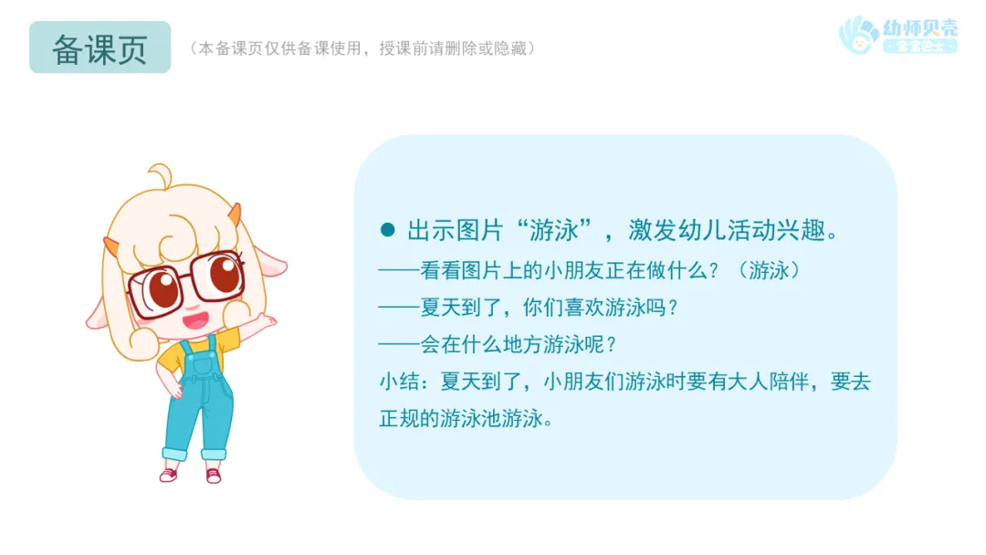 小结:夏天到了,小朋友们游泳时要有大人陪伴,要去正规的游泳池游泳。