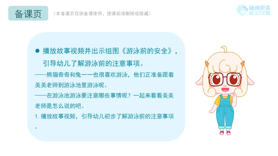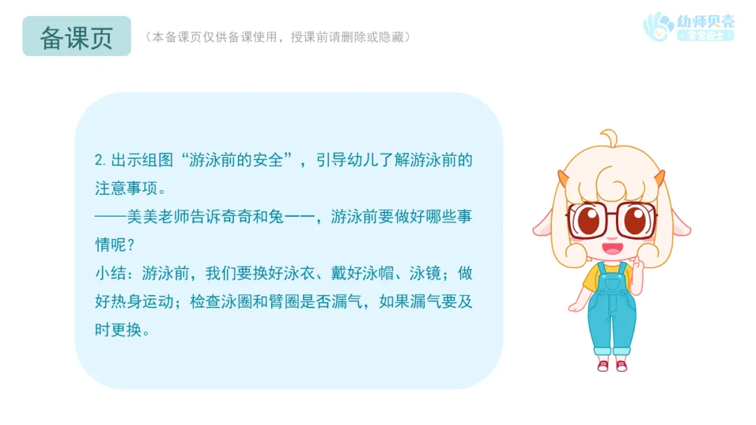——美美老师告诉奇奇和兔一一,游泳前要做好哪些事情呢?