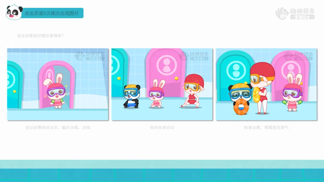 l播放故事视频并出示组图《游泳前的安全》,引导幼儿了解游泳前的注意事项。