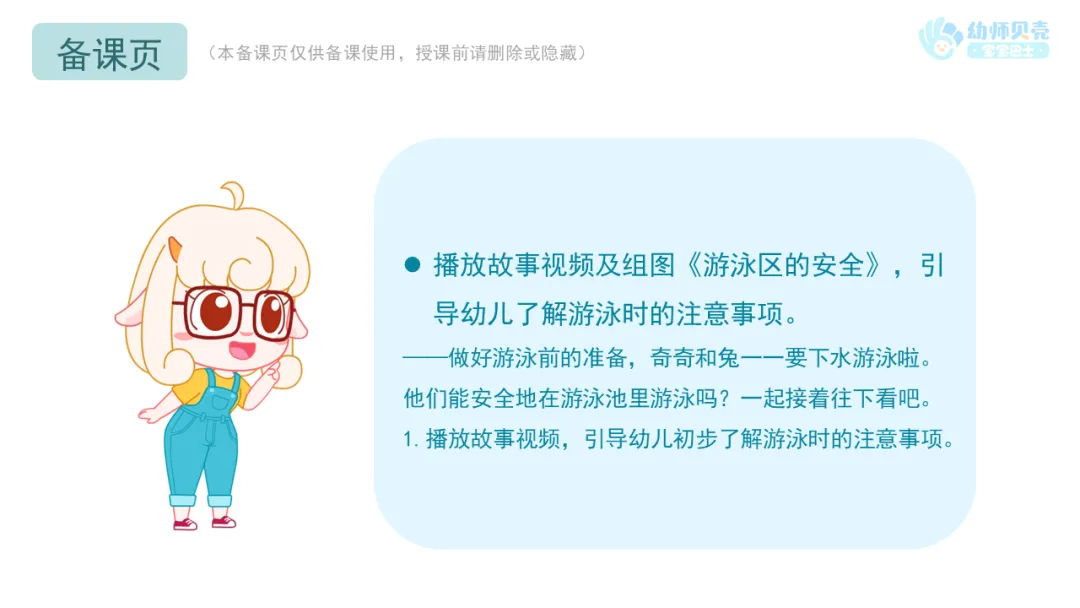 1.播放故事视频,引导幼儿初步了解游泳时的注意事项。