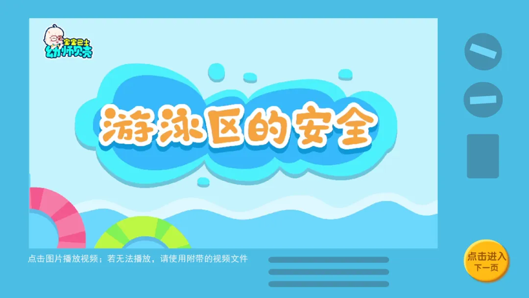 l播放故事视频及组图《游泳区的安全》,引导幼儿了解游泳时的注意事项。