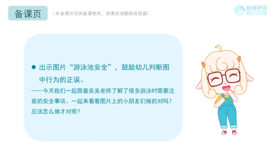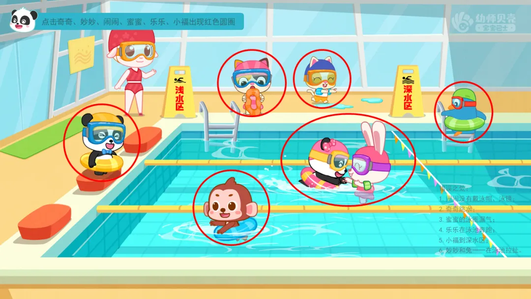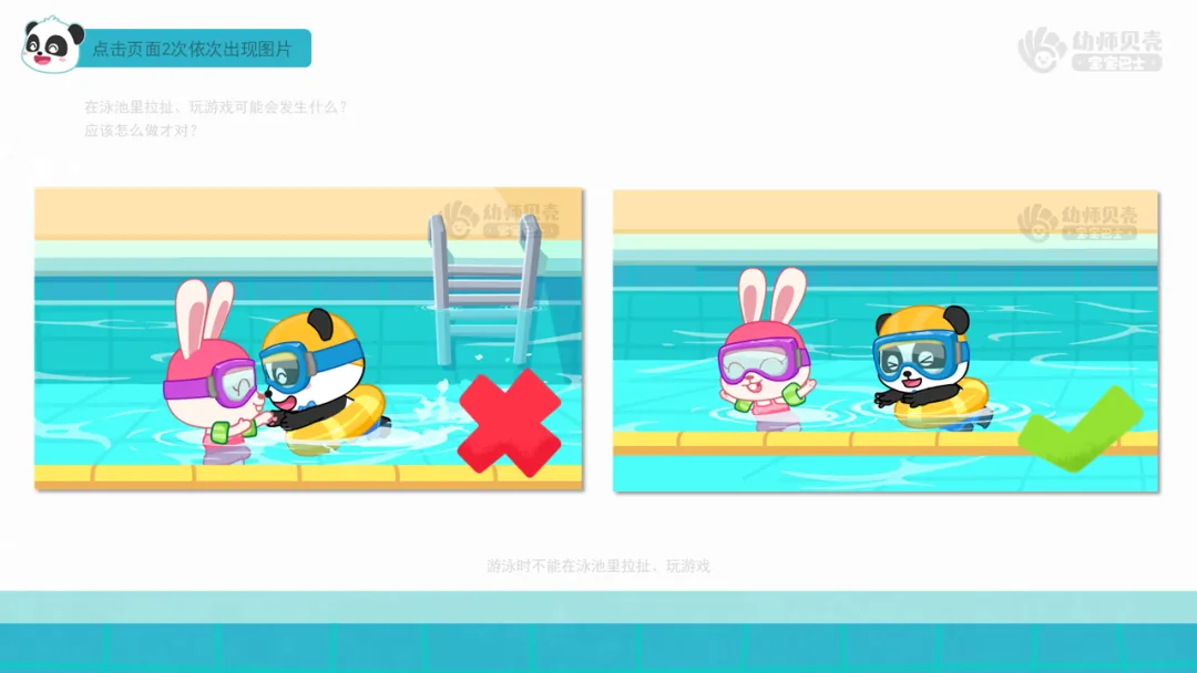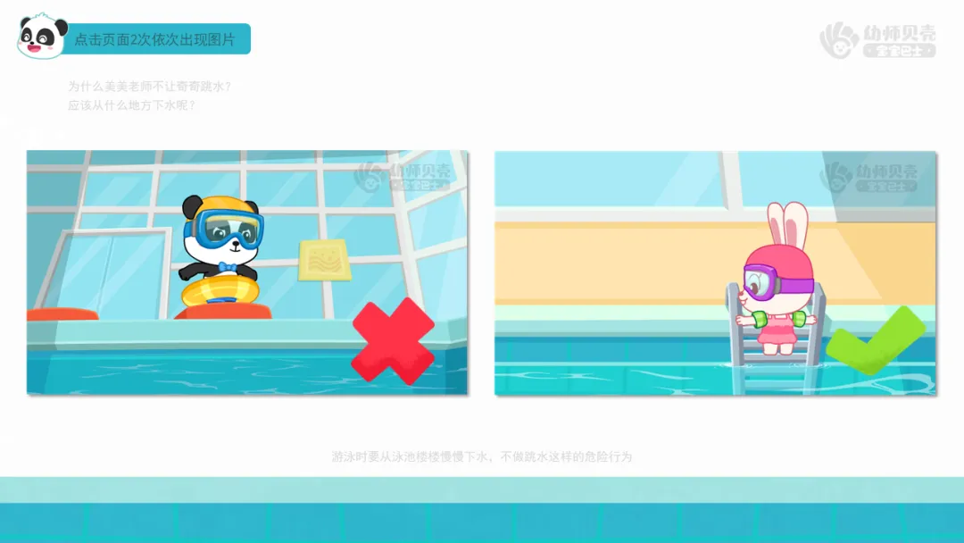 ——今天我们一起跟着美美老师了解了很多游泳时需要注意的安全事项。一起来看看图片上的小朋友们做的对吗?应该怎么做才对呢?
